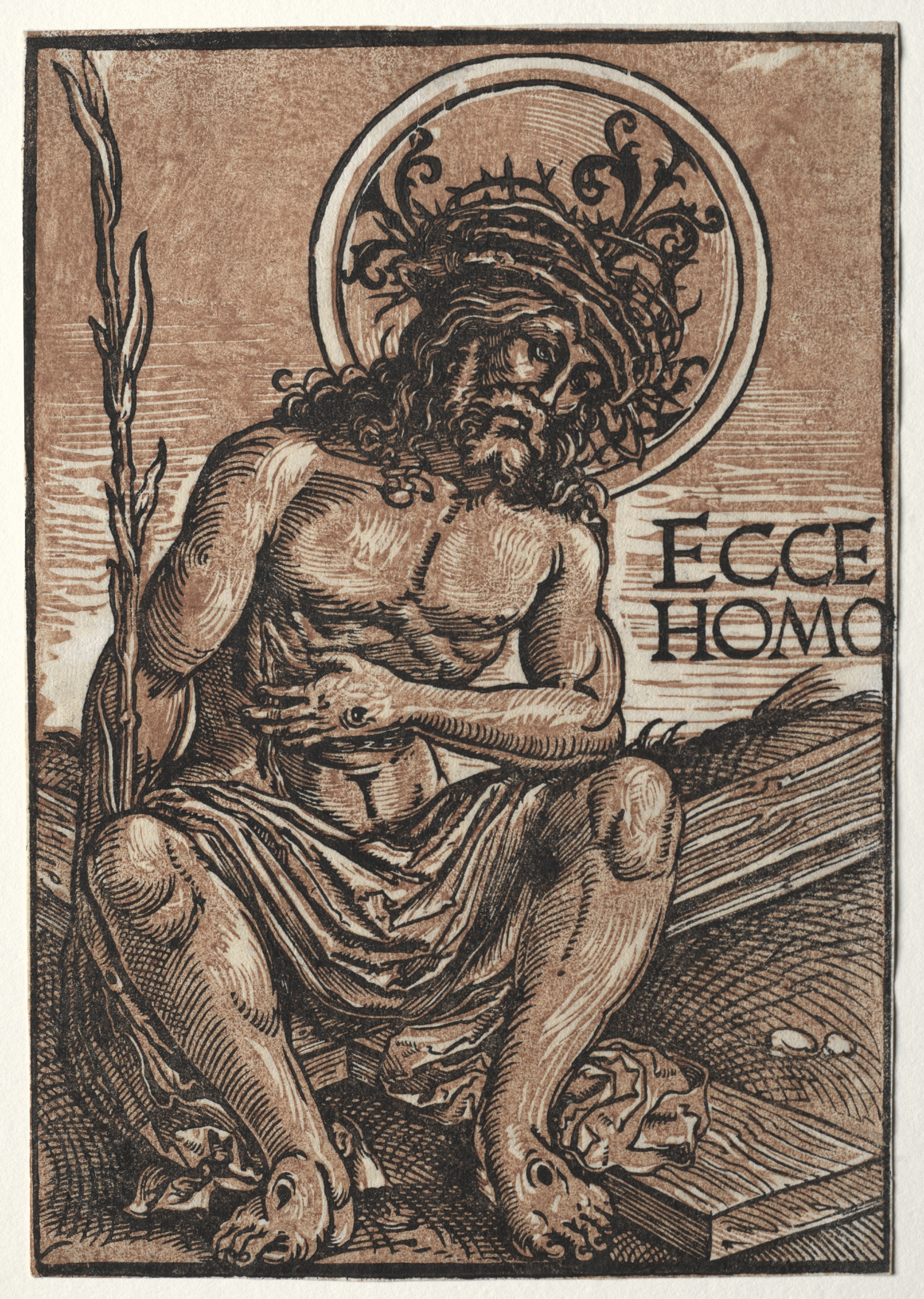 The image depicts a man sitting on a cross. He has long wavy hair and a beard and is wearing a crown of thorns. A halo surrounds his head. He wears a cloth wrapped around his waist. He sits on a cross with his left foot on a block and his right foot on the floor. He holds his left wrist with his right hand. A plant grows on the left side. The background includes text that reads "ECCE HOMO". The color scheme is sepia. The man sits on a cross with the words in a religious context.