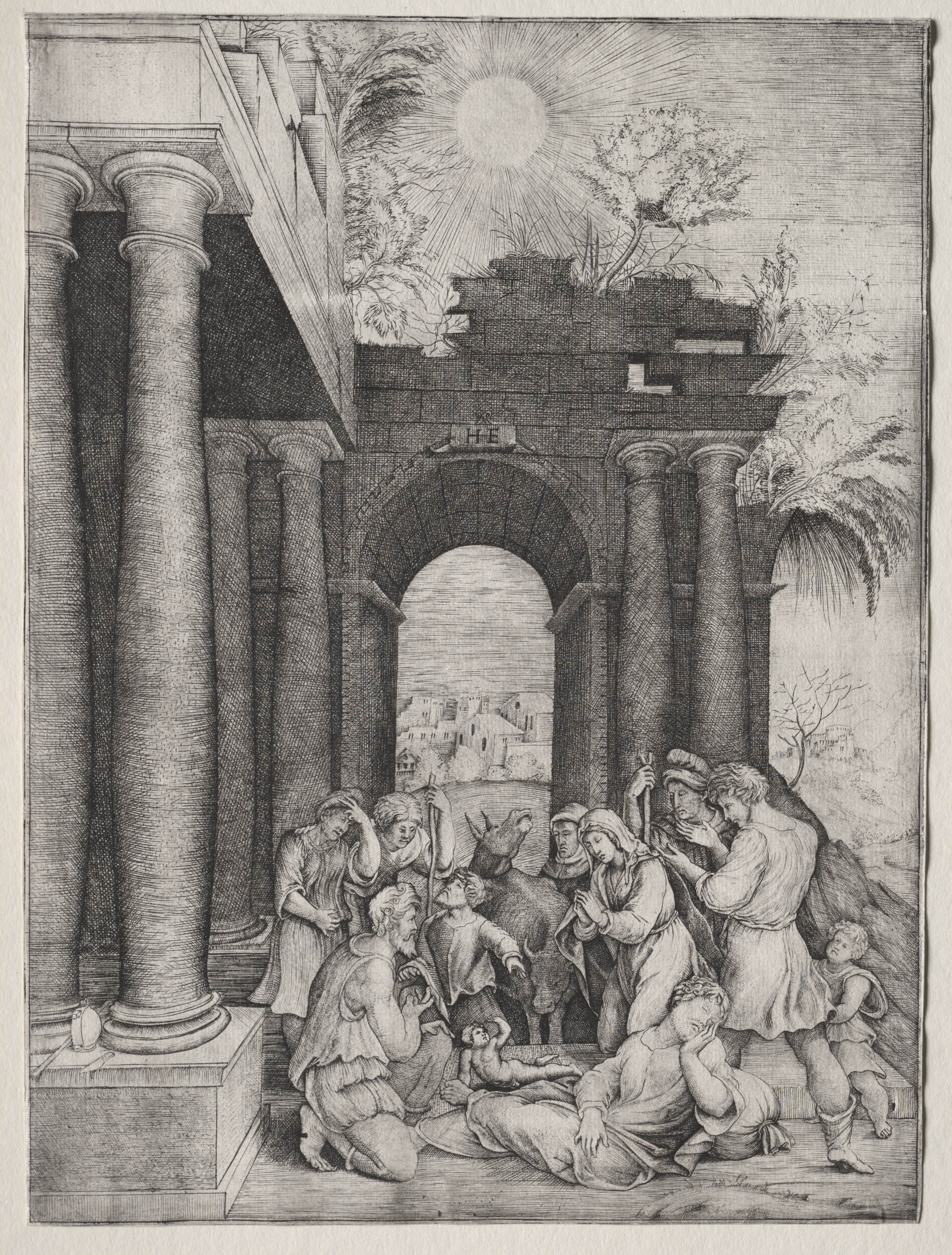 Black and white image of a group of people gathered around a baby on the ground. A woman in a headscarf sits to the left of the baby. A man stands to the right. A donkey stands behind the group. They are under an outdoor structure with columns. There is a city in the distance. The sun shines down from the top.