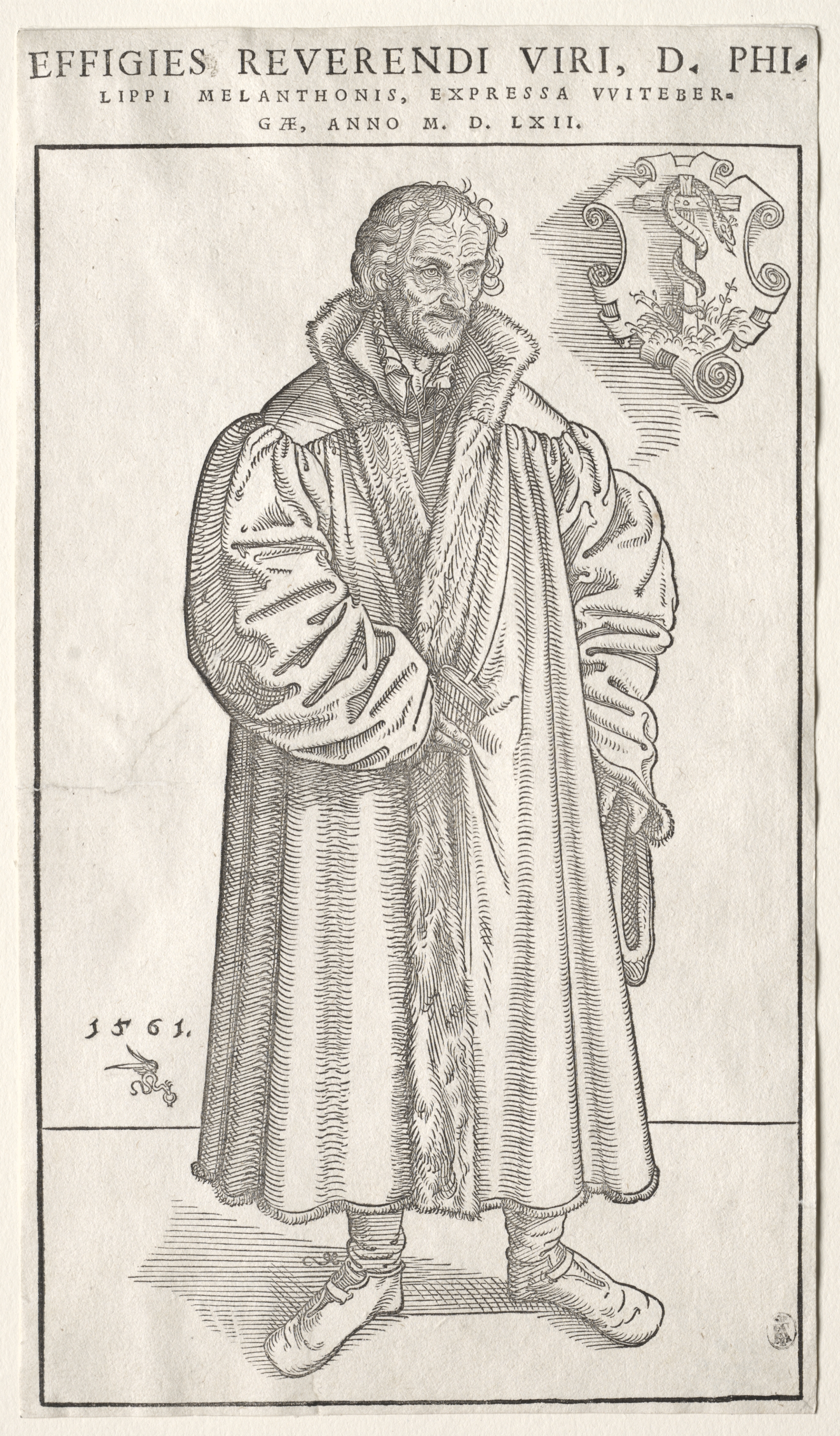 Black and white illustration of a man wearing a long robe with fur trim and a fur collar. The man has curly hair and a beard. He is standing with his arms crossed and looking to the right. He is wearing a pair of shoes. There is a decorative element in the upper right corner. The text at the top of the image reads "Effigies Reverendi Viri, D. Philippi Melanchthonis, expressa Witebergae, Anno M.D.LXII". The background is off-white with a black border.