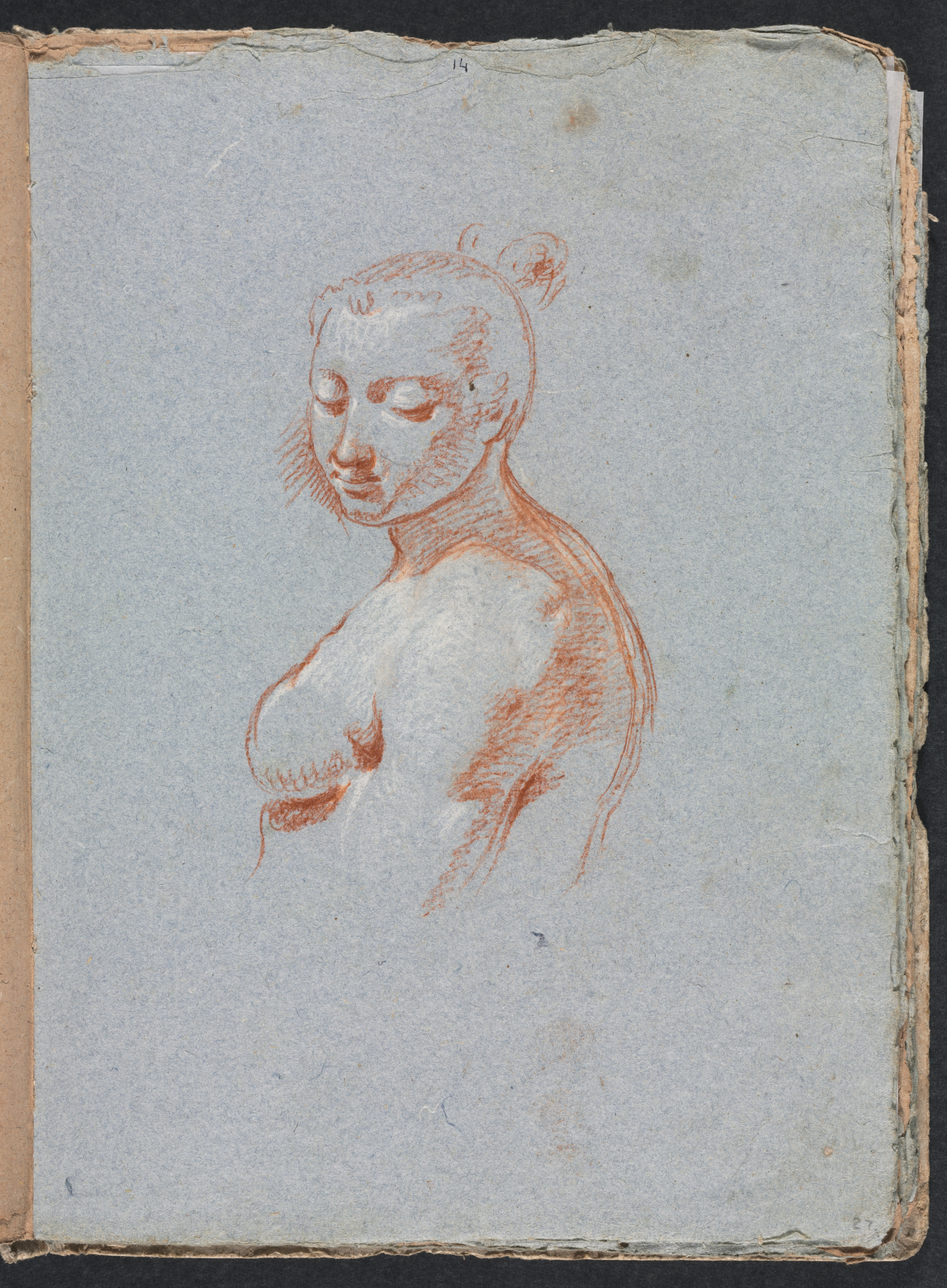 The drawing depicts a female nude with her body facing right and her head turned to the left. Her hair is pulled back and secured at the top of her head. The drawing is rendered in red chalk on a piece of paper with a gray-blue background. The paper appears aged, with rough and torn edges. The woman's facial features include a straight nose, thin lips, and her eyes are closed. Her left breast is exposed, and her right arm is not visible. The drawing style is sketchy and appears to be a study or preparatory work.