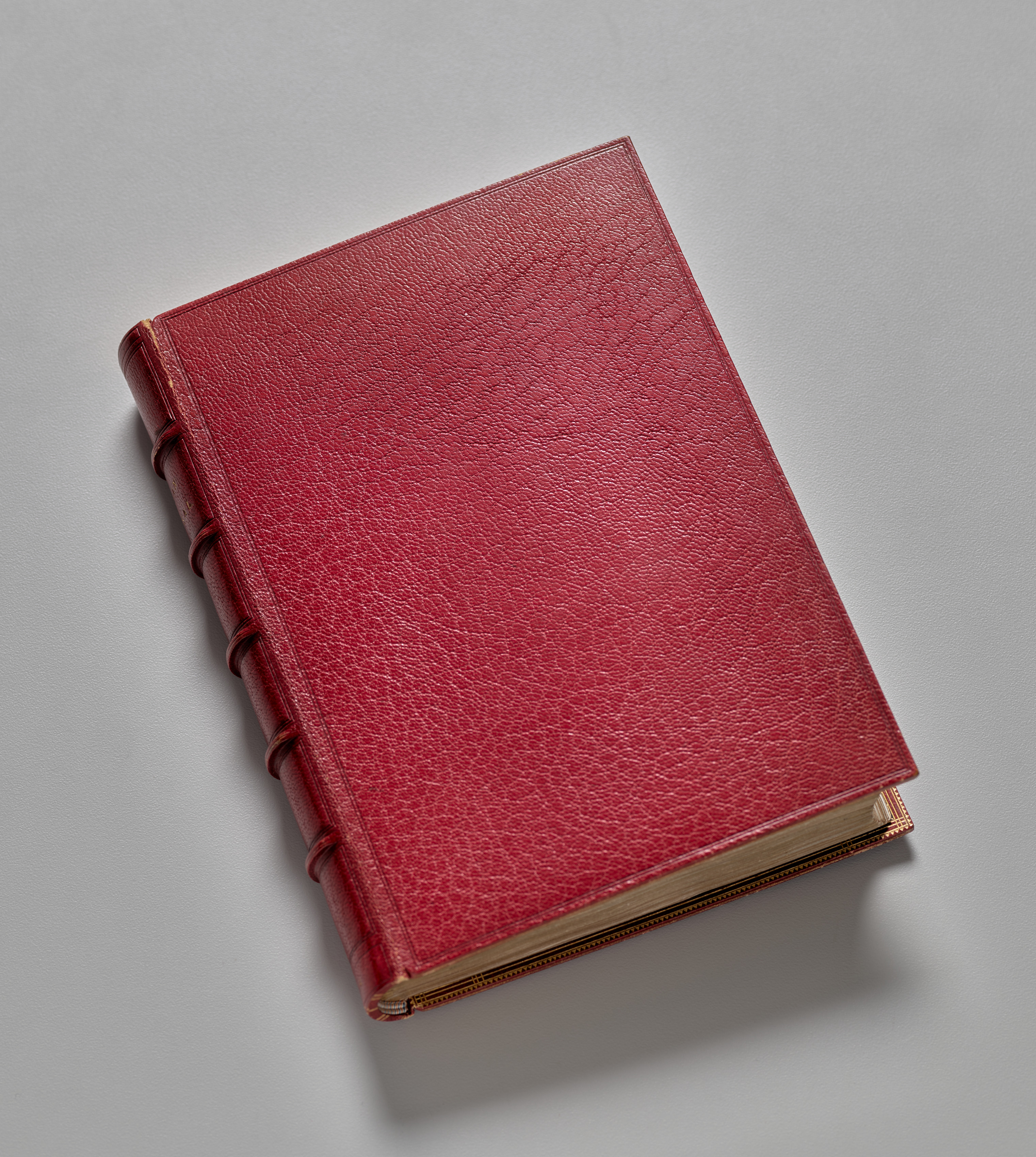 Red leather-bound book with a textured cover, six red leather bands along the spine, and gold trim on the corners and edges of the pages, lying open slightly at the bottom right corner to reveal cream-colored pages, on a gray background. Book of Hours (Use of Rouen) by Master of the Geneva Latini.