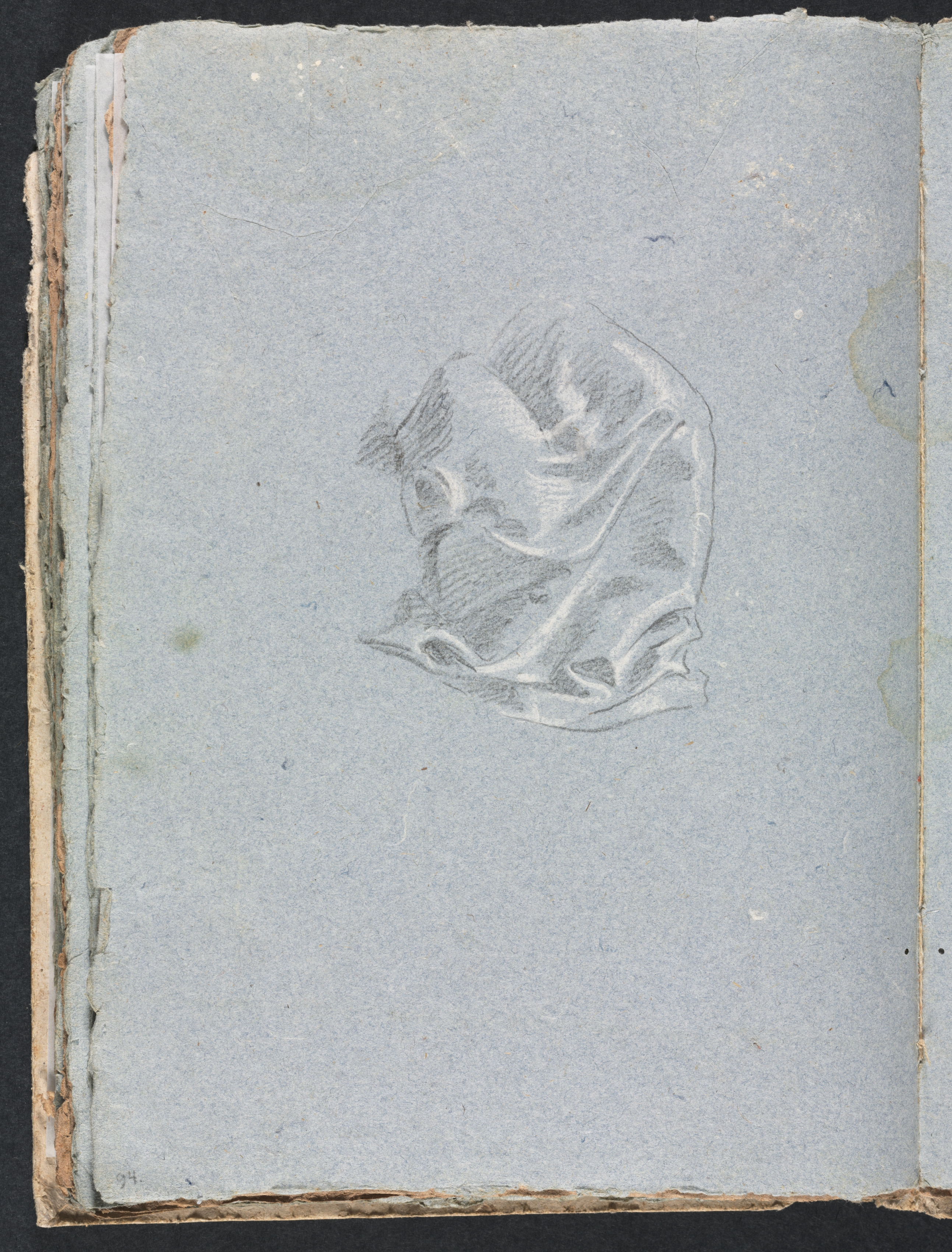 A pencil drawing on a page from a book. The page is light gray and the drawing depicts draped fabric, with folds sketched in pencil. The fabric appears to be gathered at the top and hangs in loose folds to the bottom. The page appears old and worn, with frayed edges and a darker gray area around the pencil drawing. A small number '94' written in the lower left corner.
