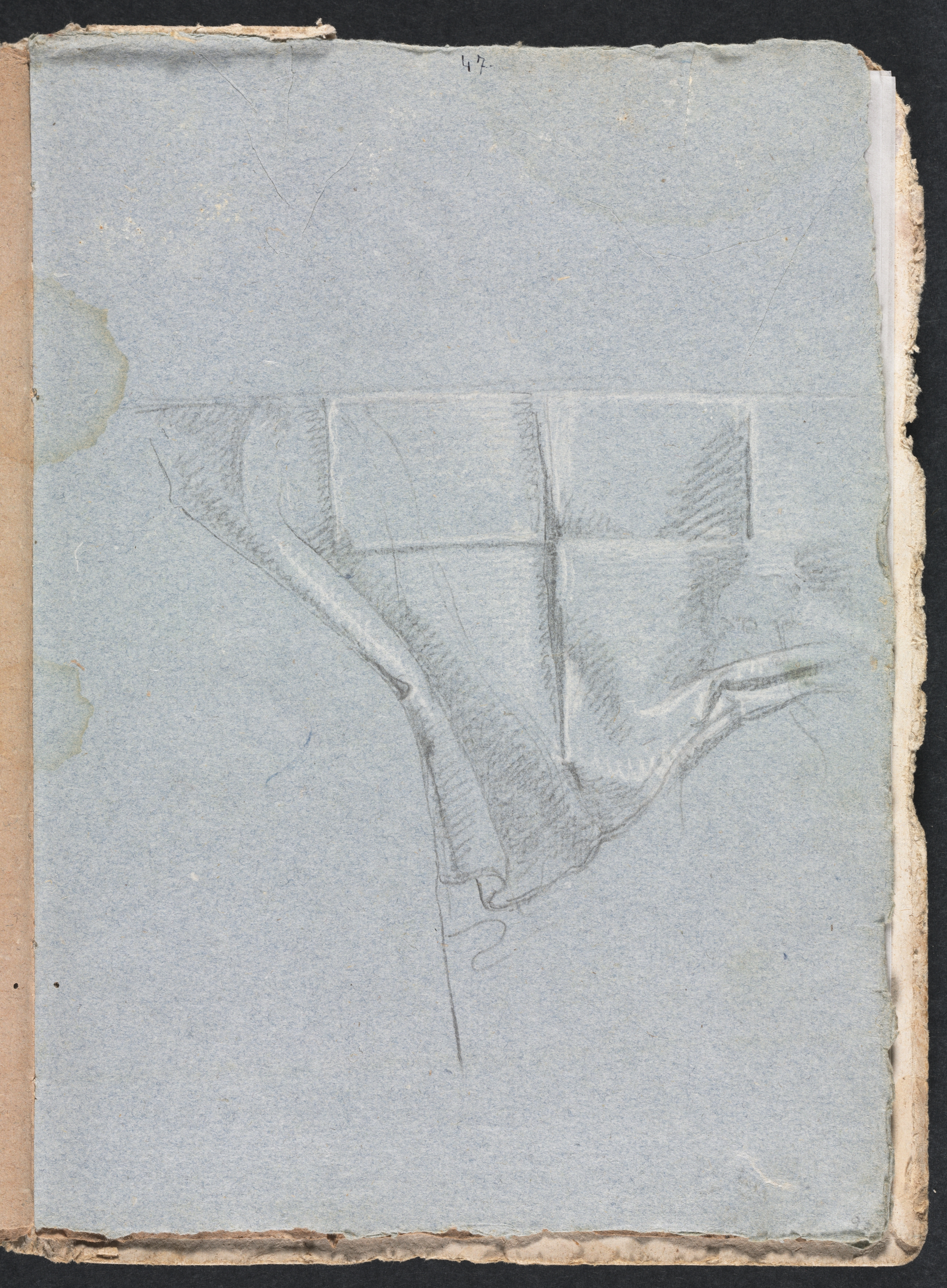 A sketch of drapery on a blue-grey piece of paper with frayed edges; paper is darker on sides due to age; a pencil drawing of folds in fabric; fabric falls in folds from upper-right; fabric has straight edge at top; fabric gathered and folded at bottom; background black.