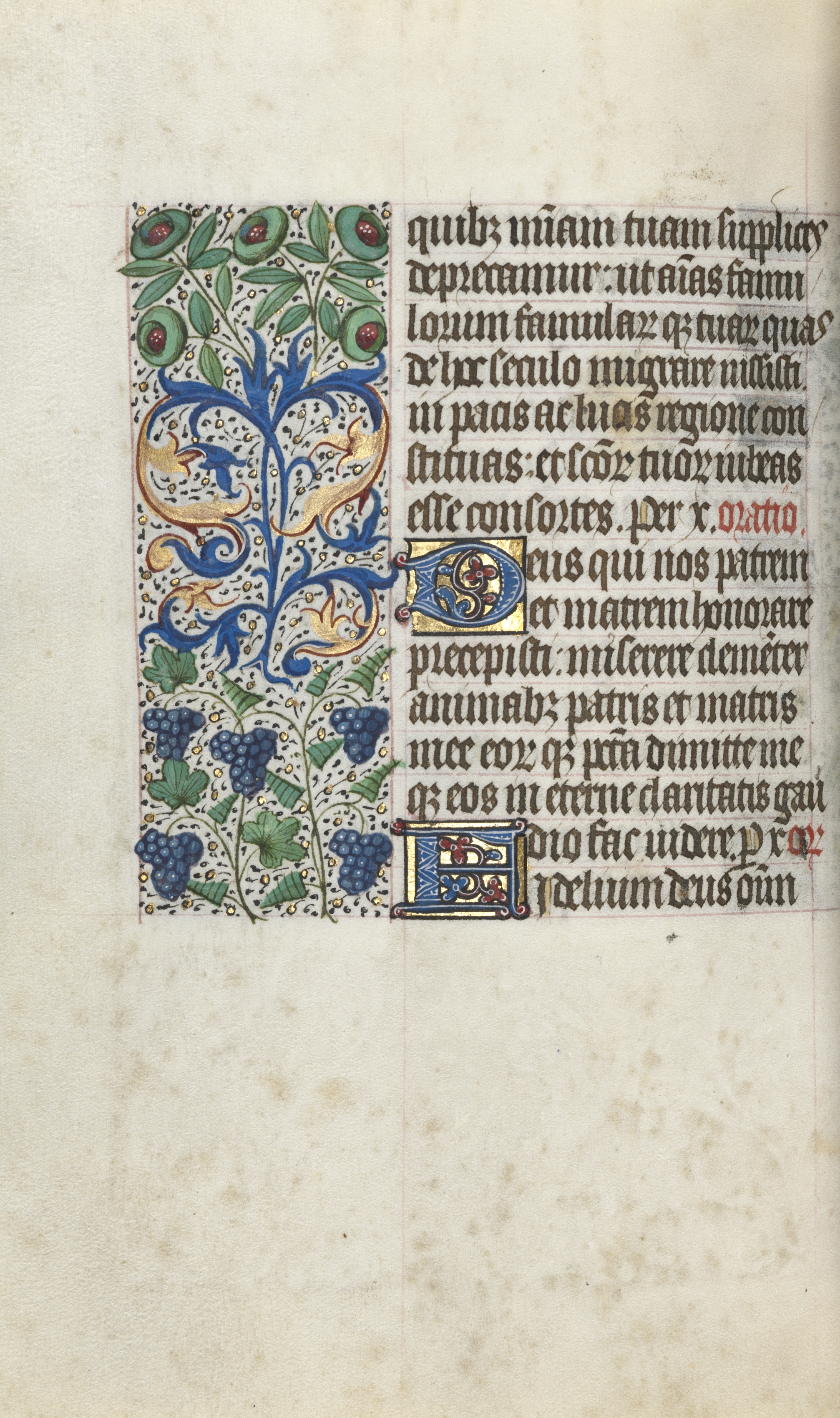 The image shows a page from an illuminated manuscript. The page is off-white with darker spots and a vertical crease down the center. The right side of the page contains black handwritten text in an old language, with some words written in red ink. The left side of the page features an intricate design with a blue tree, green leaves, and blue and purple grapes. The design is bordered on the right by the text. The design and text are enclosed within a rectangular area. The background behind the page is solid white.