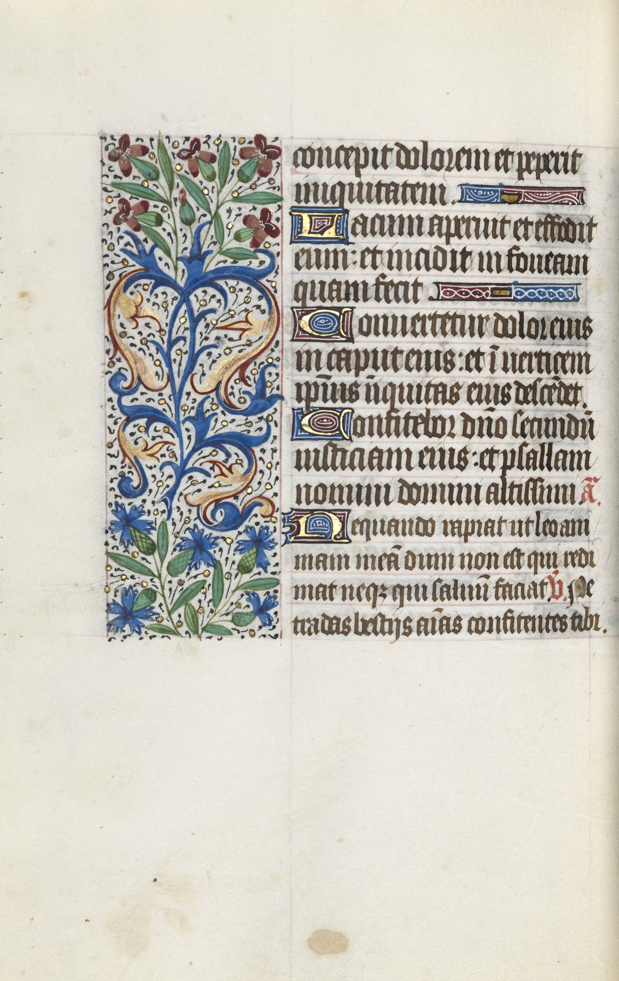 Illuminated manuscript page with text in black calligraphy on right and an illuminated border on left. Border contains blue, gold, brown and green colors. The border depicts a tree with curving branches and leaves, flowers and berries. The text is written in Latin and appears to be in a medieval script. The page has a beige background with darker spots, stains and discoloration.