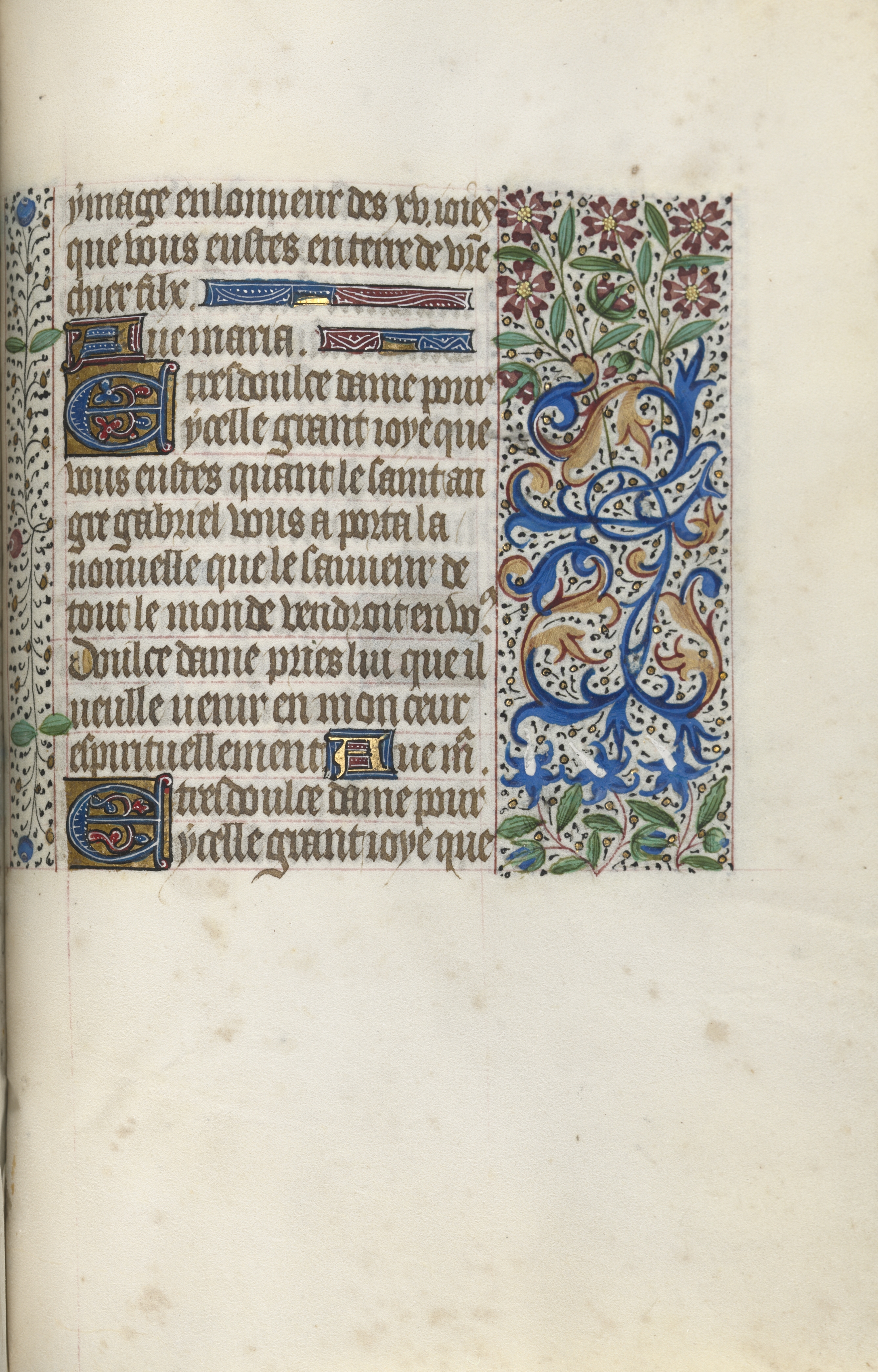 Manuscript page with text and decorations. The left side contains black handwritten text in a language that appears to be Latin or Old French. The text is arranged in paragraphs. There are two decorative squares near the bottom of the text, one with a blue "D" and the other with a blue "B", both featuring gold, red, and blue designs. The right side of the page features an intricate blue, gold, and green floral design. The design includes leaves, flowers, and curvilinear shapes. The background of the page is off-white, with some brown spots and discoloration visible.