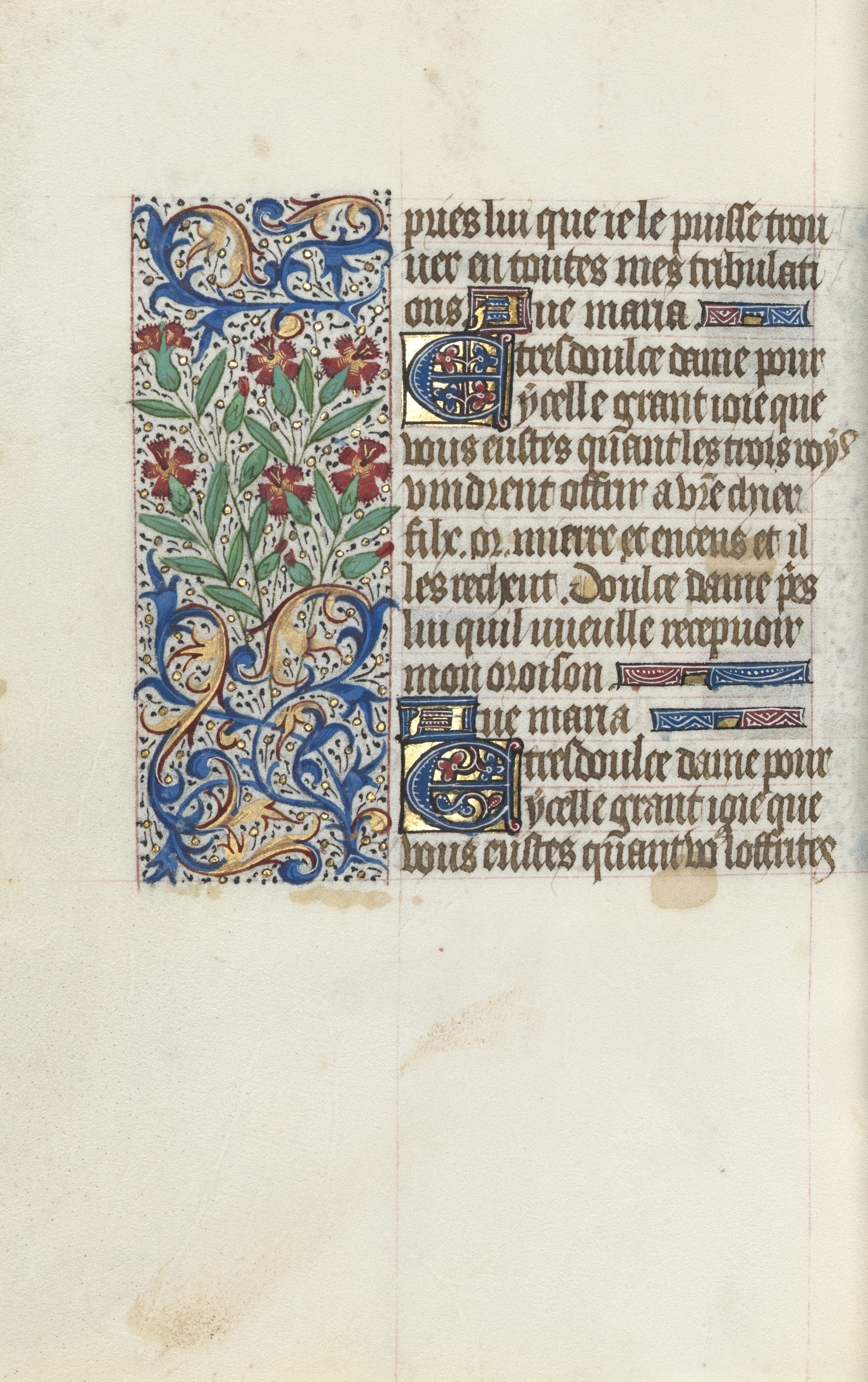 Illuminated manuscript page with text in brown ink, written in a Gothic script. The left side of the page features a vertical border of intricate floral designs in blue, gold, and red. The border contains green stems and leaves with red flowers. To the right of the border, the text is arranged in columns, with some letters larger and more ornate than others. A few of the larger letters are decorated with gold, blue, and red designs. The background of the page is off-white with some darker spots and lines.