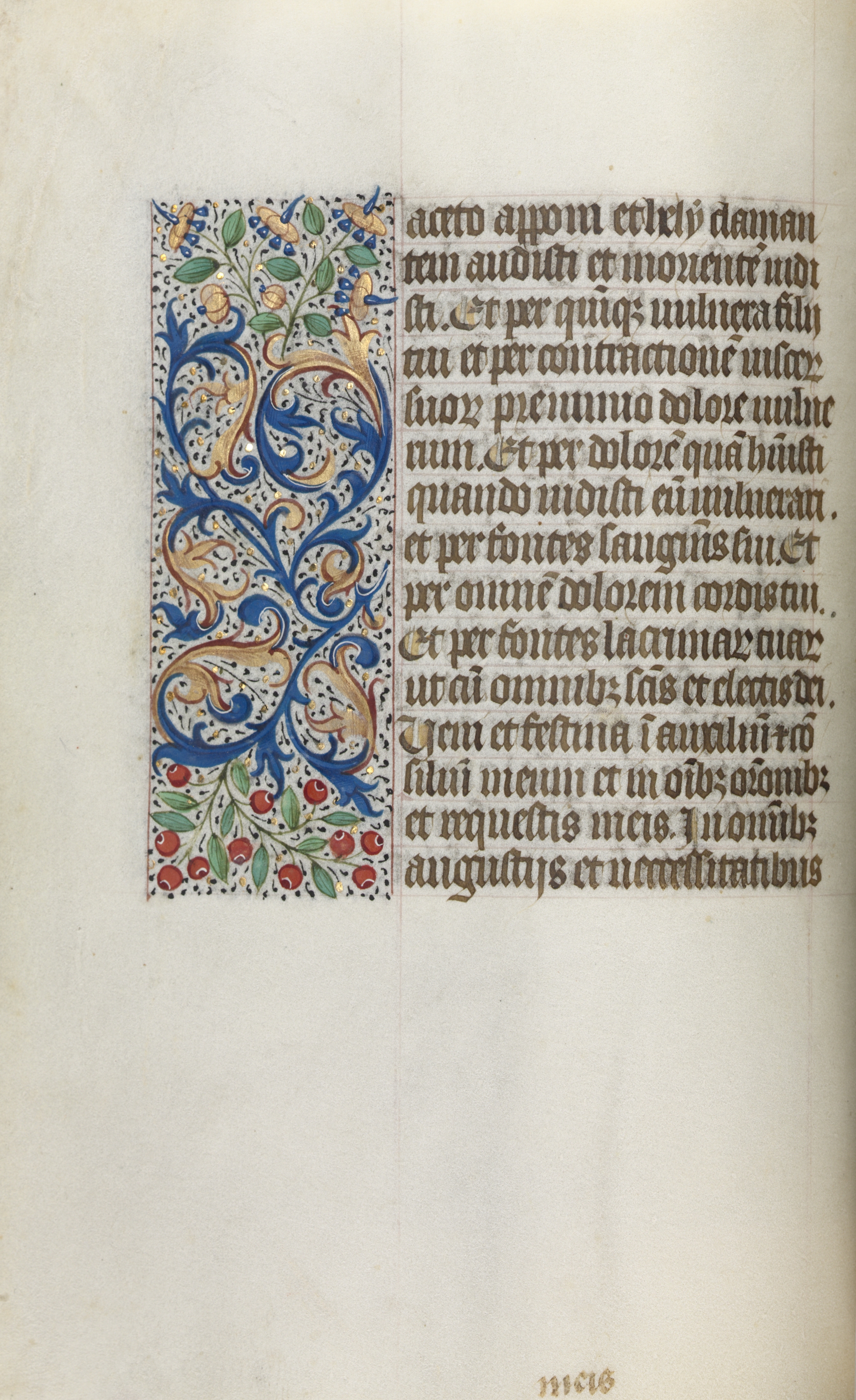 The image is of an illuminated manuscript page with a decorative border on the left side and text on the right. The left side of the page features a vertical, rectangular decorative border that takes up about one-third of the page's width. The border contains intricate designs with blue, gold, green, and red colors. The design includes curving lines, leaves, flowers, and berries. The right side of the page contains several lines of black text written in an old-fashioned calligraphy style. The text is in Latin and appears to be written in a formal, cursive script. The page's background is off-white with some darker spots and stains. A small number is written at the bottom center of the page. The overall style and design suggest that the manuscript is from the medieval period.
