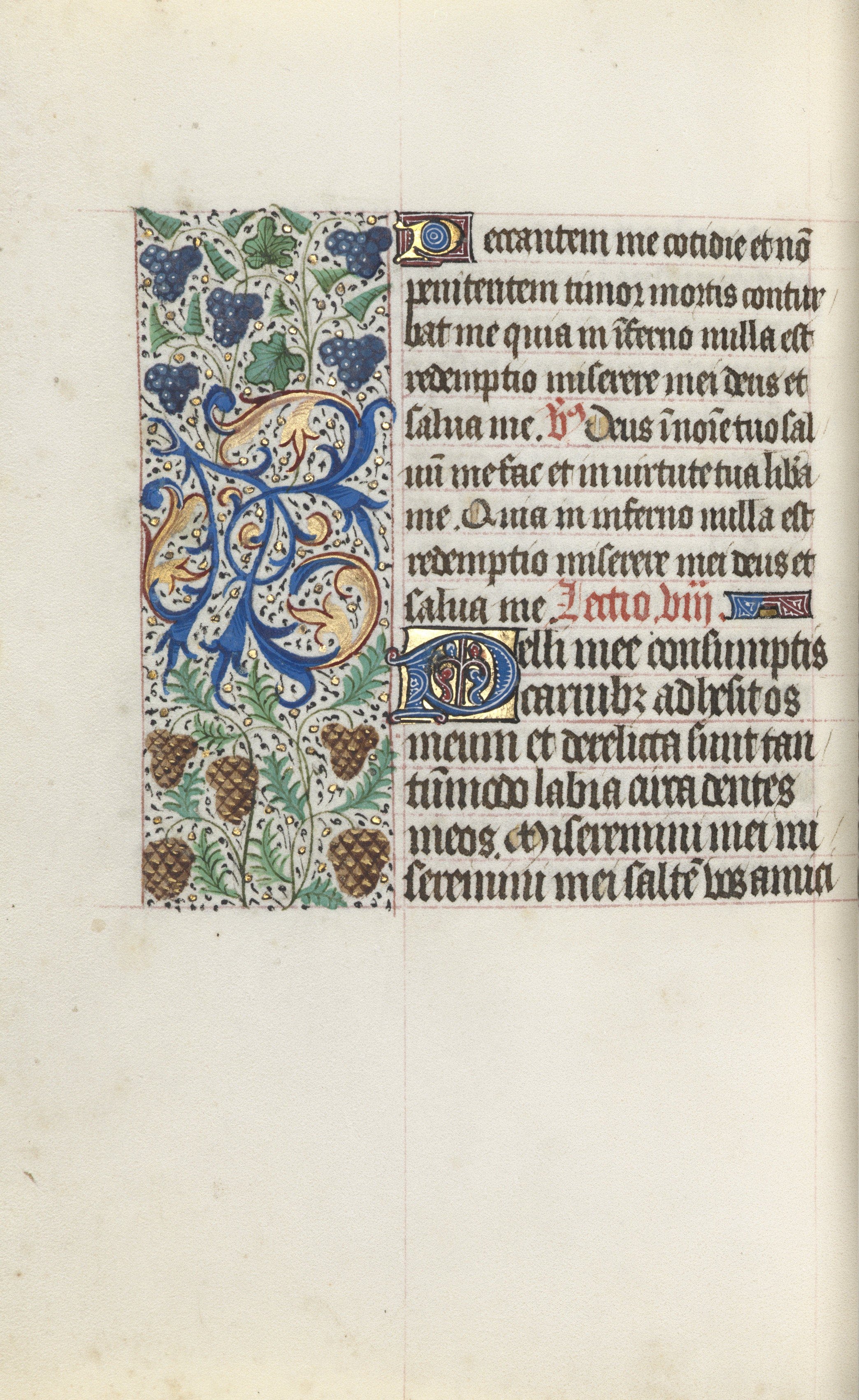 The image shows a page from an illuminated manuscript. The left side of the page features an intricate border with a floral design, including blue grapes, green leaves, and brown pinecones. The border also includes blue, gold, and orange swirling patterns. The right side of the page contains black text in an old language, likely Latin, with some red accents. The text is written in a formal, cursive script. The page has a yellowed, aged appearance with visible signs of wear and tear. The background of the image is white.