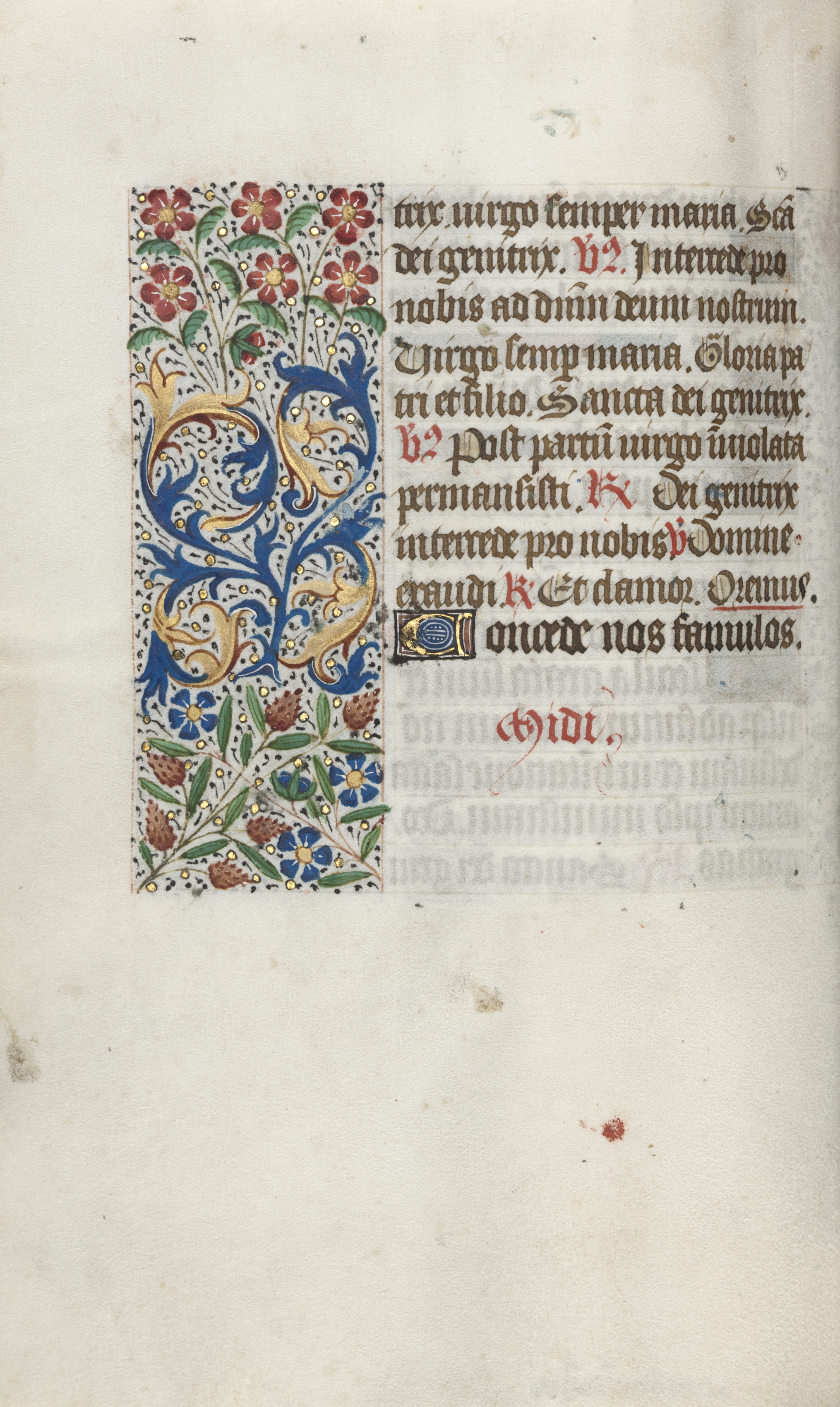 The image shows a page from a medieval manuscript. The page is off-white with darker off-white and brown spots. On the left side is an illuminated border with blue, gold, red, and green colors. The border contains flowers, leaves, and curled vines. The right side of the page contains black and red text written in an old-fashioned calligraphy style. The text is arranged in paragraphs with some words in red. There are two small gold squares on the left side of the page with a design inside near the bottom. The background behind the page is white.