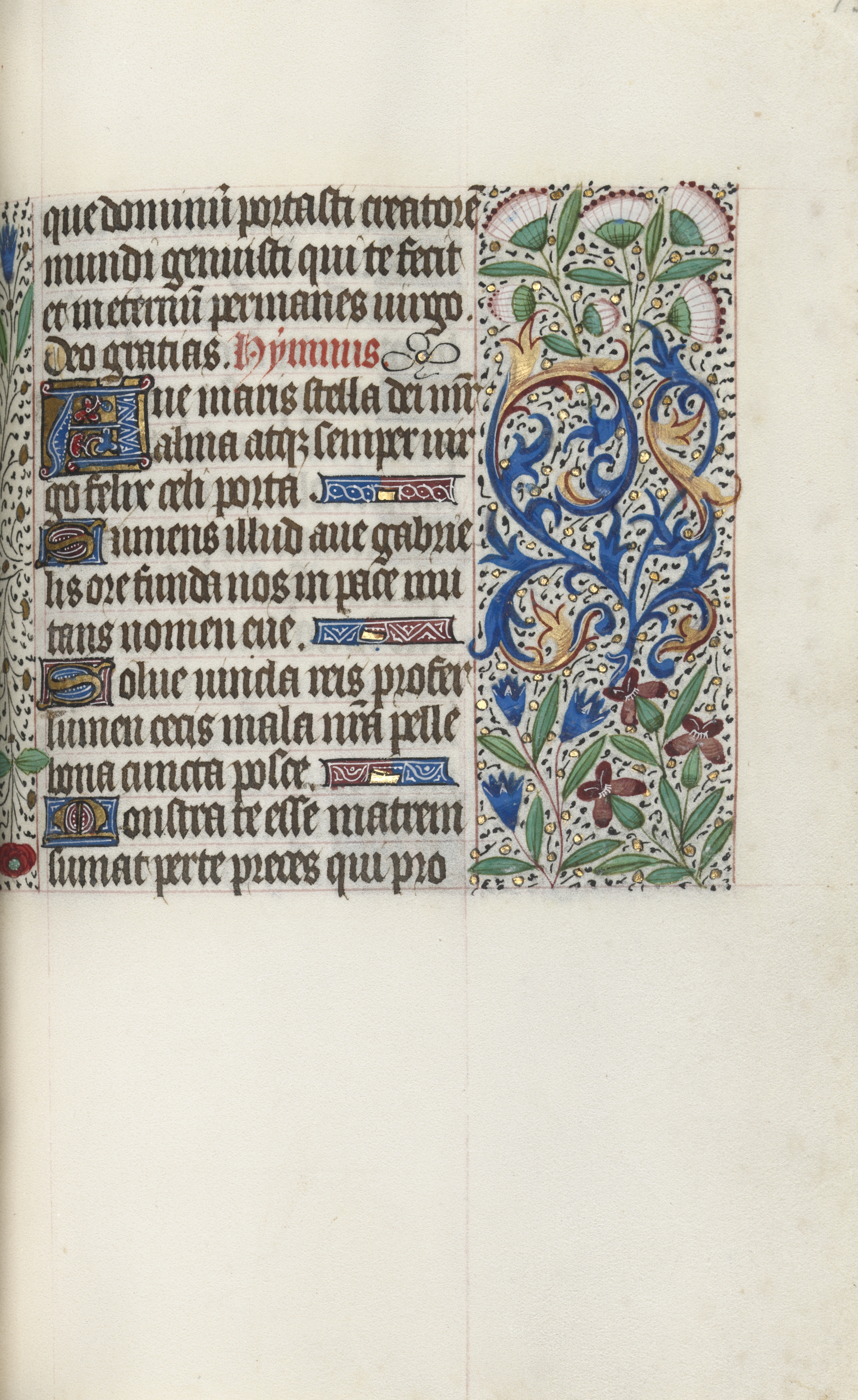 The image shows an open book with a page of text and a decorative border. The book's page is off-white with darker edges and a vertical line down the center; the right half of the page is empty. The left side contains black text in a medieval style, with some words written in red ink. Small rectangular boxes with colorful patterns are interspersed throughout the text. The right side of the page features a colorful, ornate border with a blue, green, and gold floral design on a white background. The border includes blue flowers and green leaves, as well as gold accents.