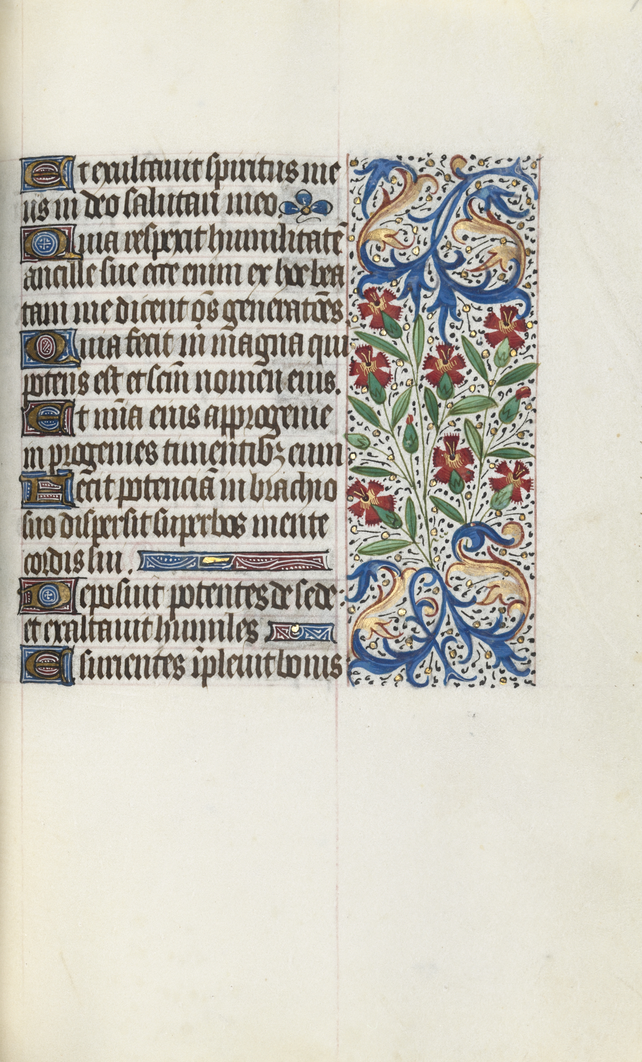 The image shows a yellowed page with an illuminated manuscript. The text on the left side is written in black calligraphy, arranged in 17 lines, with three small illuminated squares on the left side of the text, at the top, middle, and bottom. The right side of the page features an intricate border with a blue vine and red flowers. The border is ornate, with gold accents and green leaves. The page appears to be yellowed and aged, with some discoloration visible. A thin red line runs vertically down the center of the page, to the right of the text. The right third of the image is white.