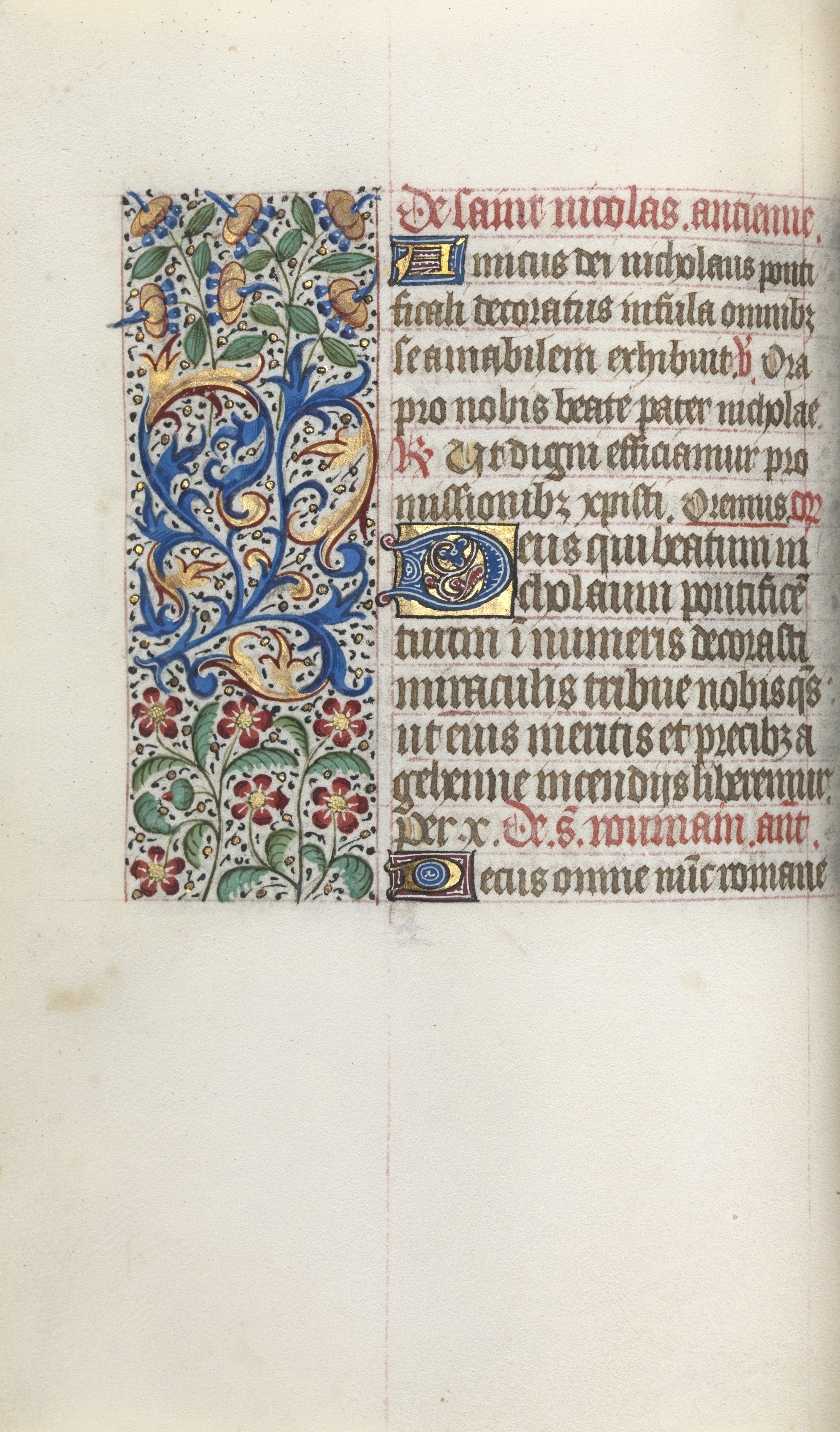 A vertical rectangle divided into two sections. The left section contains an illuminated design with a white background. The design features a blue and gold curved line with decorative swirls at the top and bottom. The line is surrounded by flowers and leaves in shades of blue, green, gold, and red. A gold section with blue accents is at the bottom. The right section contains black text in a medieval font, with some red accents. The background of the image is off-white, with a slight yellow tint and some darker spots and lines throughout. A thin red line runs vertically down the right side of the rectangle. A white border surrounds the image on the bottom and right side.