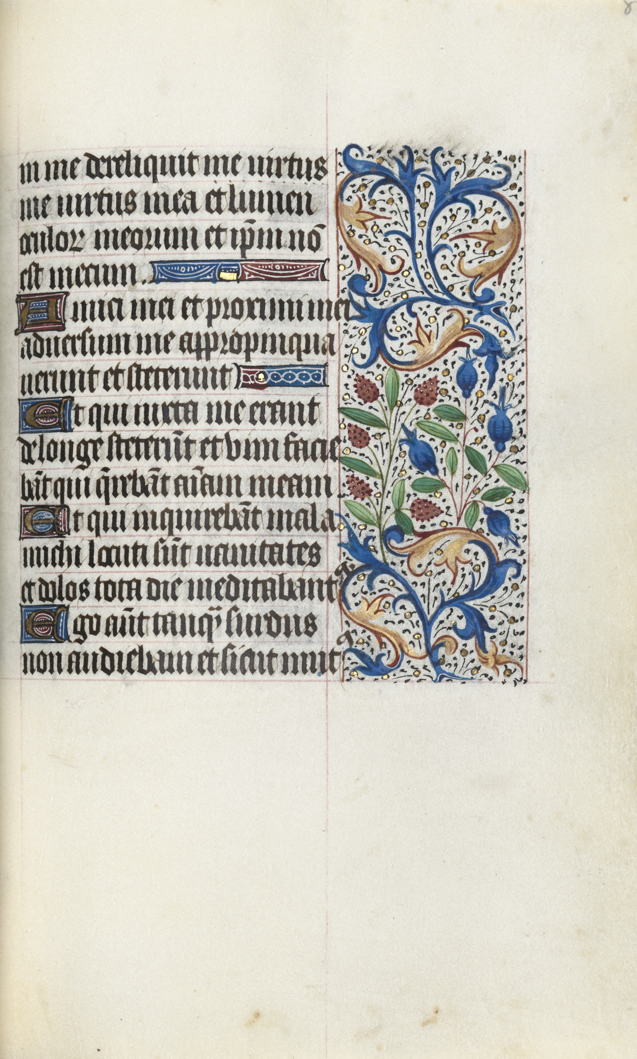 The image shows a page from a book with black text on the left and an illuminated border on the right. The text is written in an old-fashioned style, likely Latin, and is arranged in a column that takes up about half of the page. The text is written in black ink and appears to be handwritten. The illuminated border on the right side of the page features a blue, gold, and green design with leaves and flowers. The design is intricate and ornate, with curved lines and shapes that fill the border. The background of the page is off-white, with some darker spots and discoloration visible. The right side of the page has a large blank space.