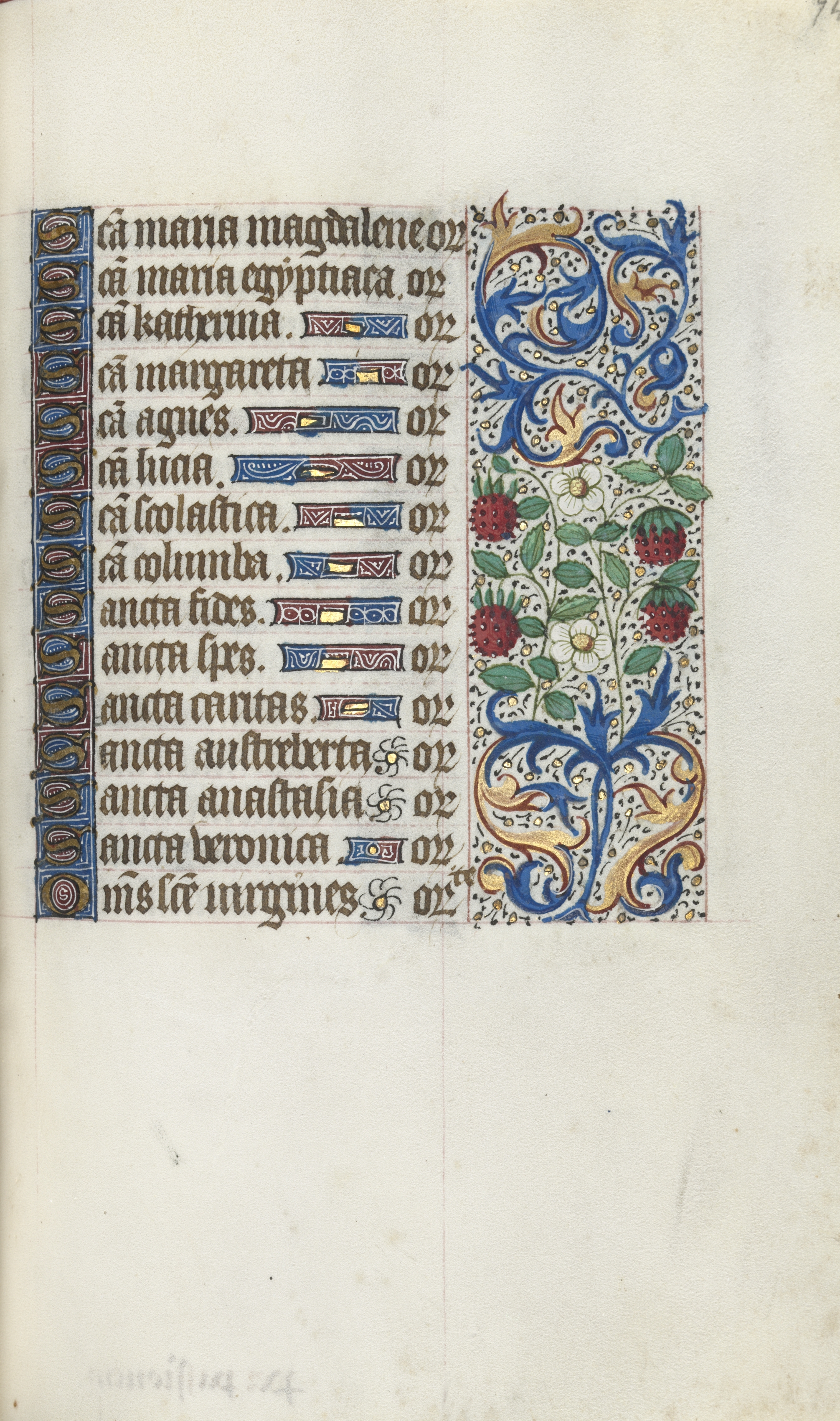 The image depicts a full-page illuminated manuscript. The page has a beige background with darker spots and lines. A column of black calligraphy text on the left side that extends to the top and bottom. To the right of the text are colorful illustrations. A border on the left edge shows a blue background with gold and white designs. A floral pattern on the right edge showcases a blue and orange vine-like design at the top and bottom, with green leaves and red and white flowers in the center. The bottom of the page features a grayish smudge.