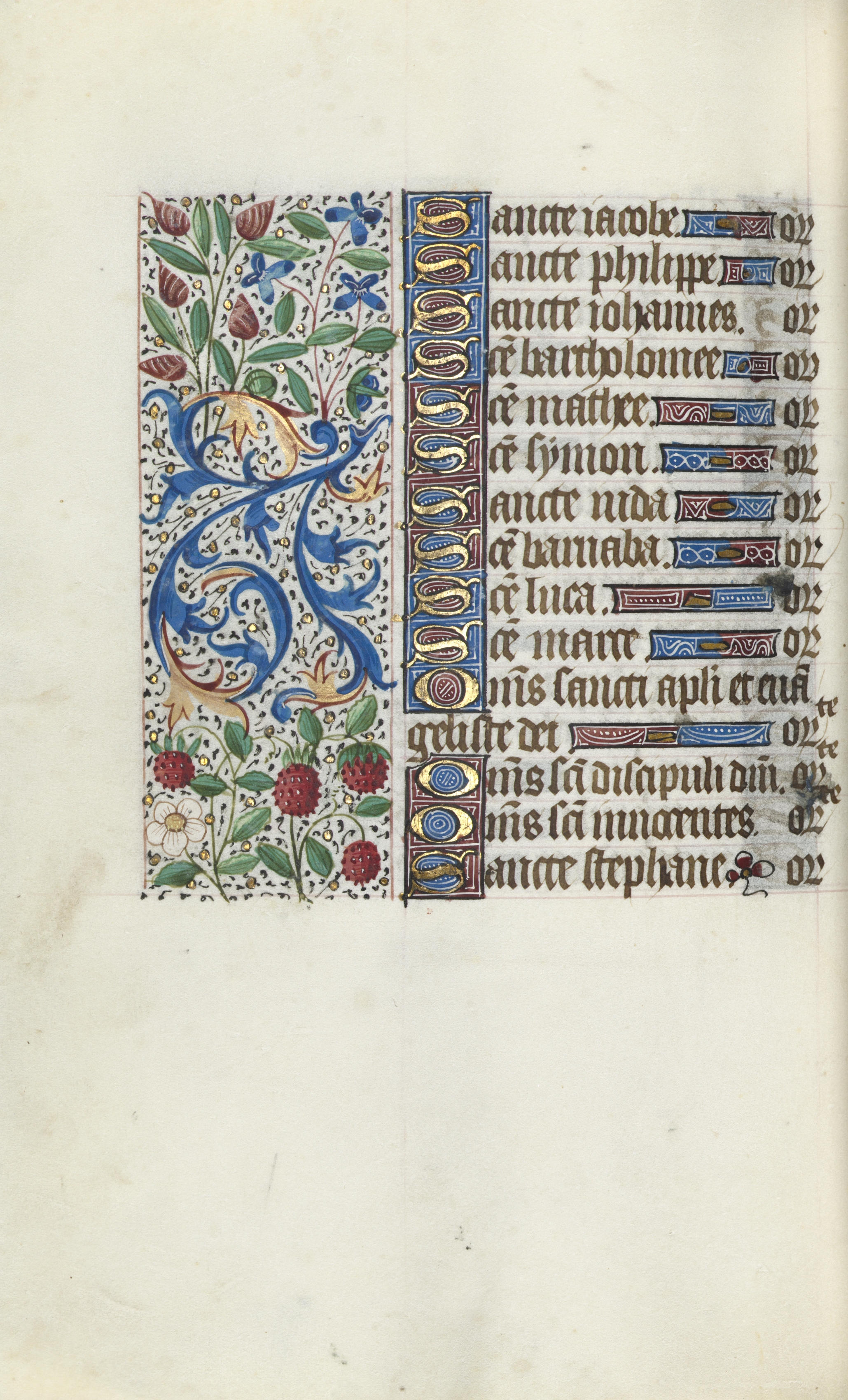 Illuminated manuscript page with a large blue and gold initial on the left side, surrounded by a floral border with green leaves, blue, red and brown flowers. The right side features a column of black text on cream-colored parchment, with blue, red and gold decorative borders separating the text into sections. Small blue and red boxes are scattered throughout the text column. The page has a cream background with darker spots and marks throughout.