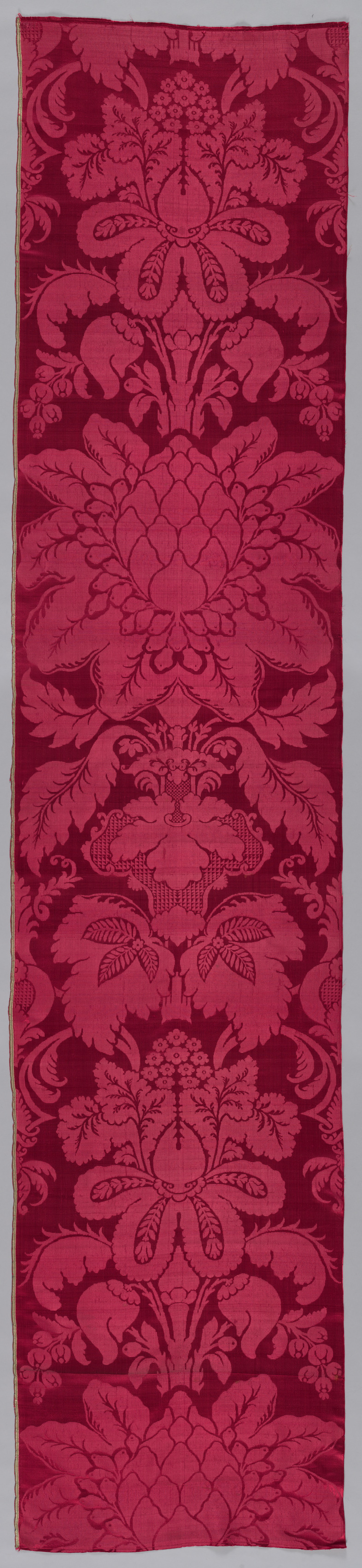 Two Large Damask Cloths. The image shows two long, narrow pieces of fabric laid side by side. The fabric is a deep red color with a damask pattern. The damask pattern features a repeating design of floral motifs and leaves. The motifs are symmetrical and appear to be mirrored. The fabric has a smooth texture and appears to be made of a shiny material, possibly silk or cotton. The background behind the fabric is light gray. The edges of the fabric are rough and uneven, suggesting they may have been cut or torn. The overall appearance of the fabric suggests it may be antique or vintage.
