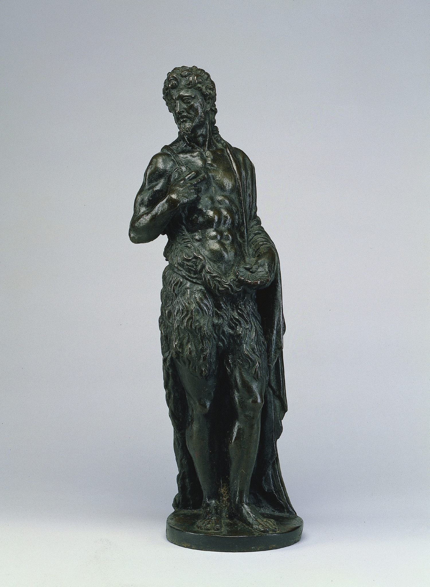 Dark green statue of a man with curly hair and a beard, wearing a fur loincloth and a cape draped over his left shoulder. His left hand is raised to his chest, and his right hand is on his stomach. He has a cord or string around his neck. The statue stands on a circular base. The man is barefoot. The statue depicts Saint John the Baptist by Angelo de Rossi.