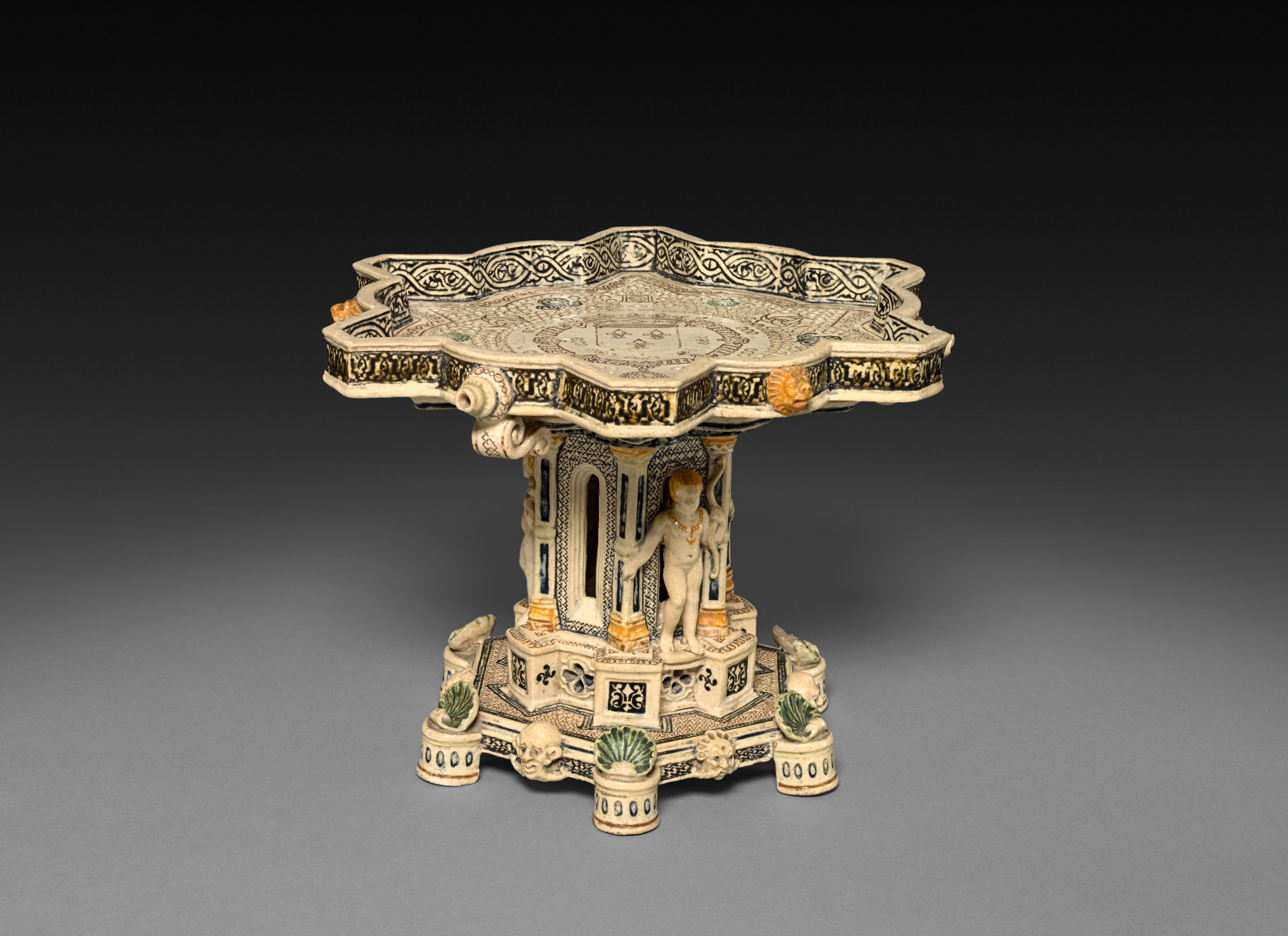The pedestal dish has a wide, shallow bowl with a wavy rim. The bowl is decorated with a black and gold pattern around the edge and a central design. The pedestal is ornate, featuring a figure standing between columns. The base of the pedestal is octagonal with decorative elements and four cylindrical protrusions. The background of the image is dark at the top and light at the bottom. The pedestal dish is titled "Pedestal Dish" and is attributed to "Saint-Porchaire".
