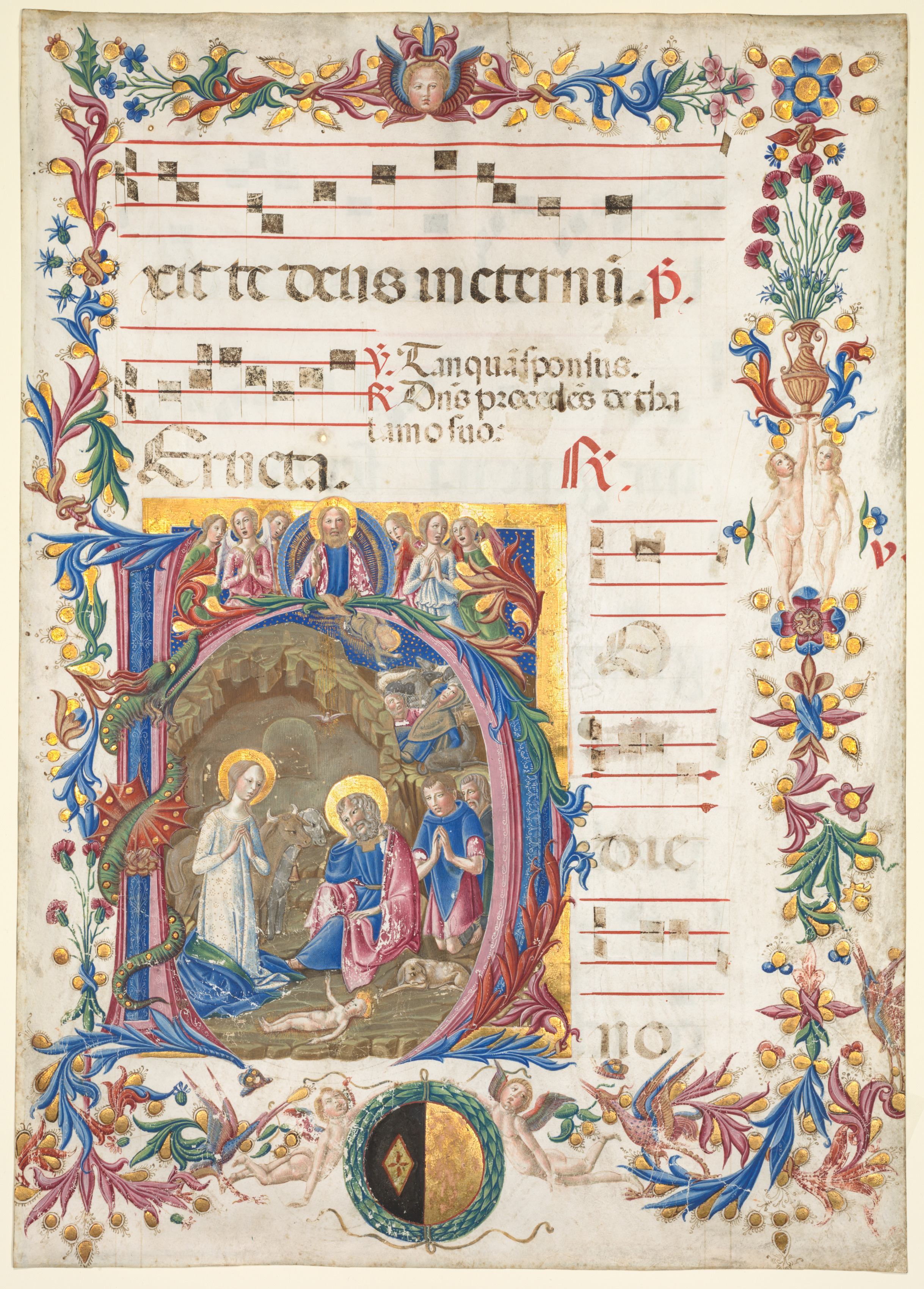 Leaf from an Antiphonary: Initial H with the Nativity (recto)