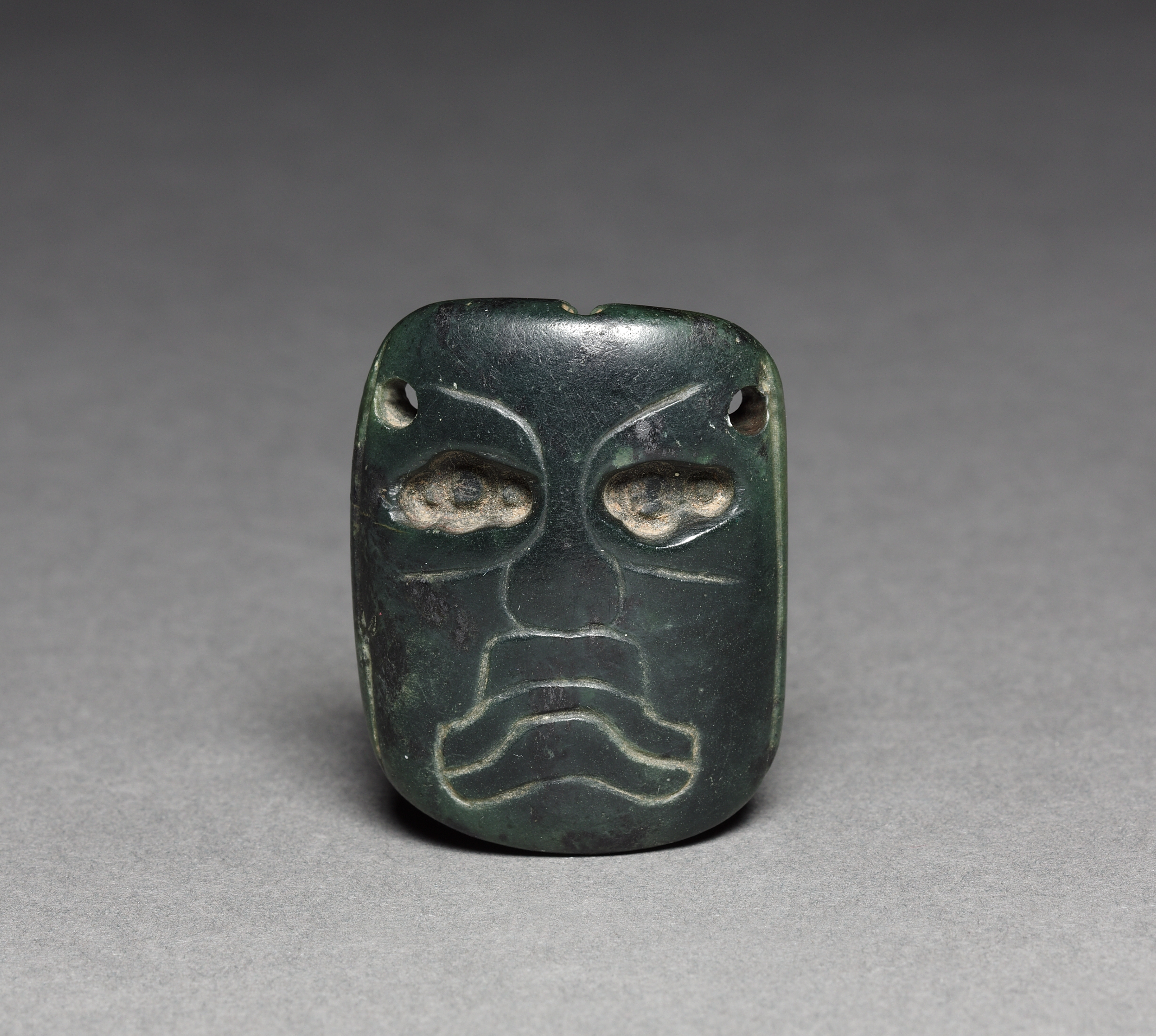 The Mask by Constantin Brancusi, a dark green stone sculpture with a smooth surface, roughly rectangular in shape with rounded edges; face carved with a prominent forehead, small oval eyes, thin eyebrows, nose, and a thin-lipped mouth; small circular holes on either side near the top; weathered appearance with scratched and marked surface; sits on a gray surface with a gray background.