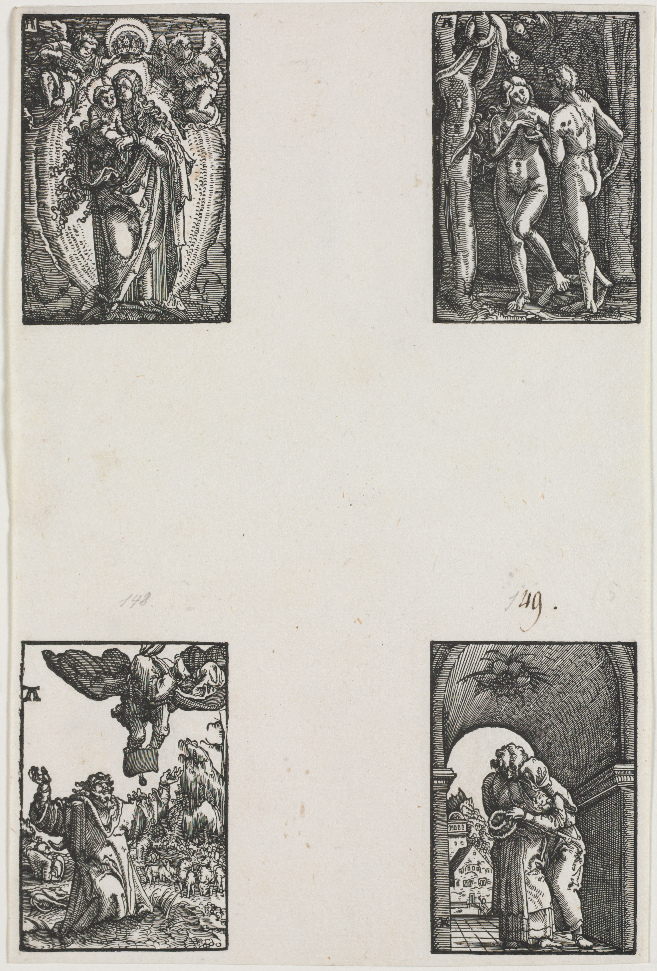 The Fall and Redemption of Man by Albrecht Altdorfer: Top left: A woman in long dress and head covering, surrounded by a haloed semi-circle, holds a baby. A man on the left holds a tree-like plant. Top right: A man and a woman, both nude, stand next to each other; a figure appears on the left; background appears to be a room. Bottom left: A man wearing a long robe, left arm raised, watches a winged figure above him; people and animals are to his right in the background. Bottom right: A man and a woman embrace; the man wearing a long robe; the woman wearing a long dress and head covering; they are under an archway; buildings appear in background.