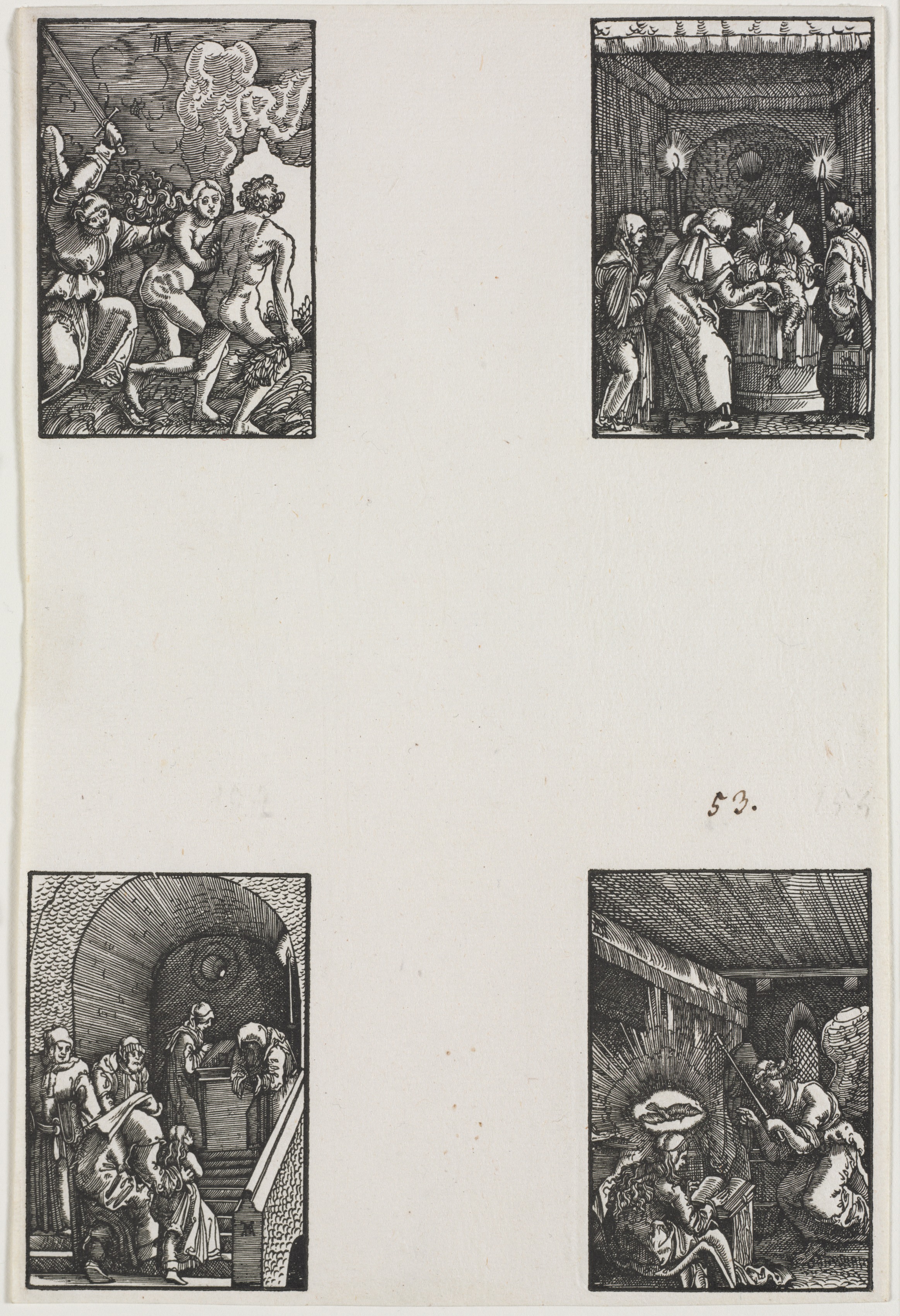 The Fall and Redemption of Man by Albrecht Altdorfer: Four black-and-white woodcut scenes arranged in two rows of two on an off-white background. The top-left scene depicts two nude men and an angel amidst flames; one man holds a sword. The top-right scene shows six people gathered around a cylindrical object in a room. The bottom-left scene features people standing or sitting in and around an arched entryway; one person stands on stairs. The bottom-right scene depicts an angel pointing towards a man with a halo sitting at a desk.