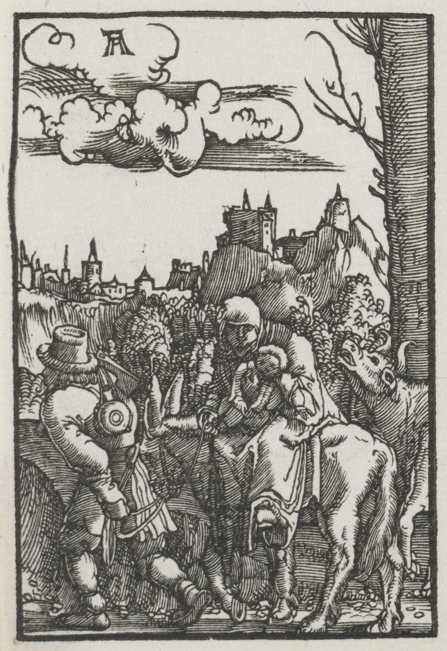 Black and white woodcut image. A man on a donkey rides to the right with a man walking beside him. The rider wears a round hat and carries a staff. The man beside him wears a wide-brimmed hat with a plume and carries a shield. A third figure wearing a brimmed hat, billowing cloak, and boots walks behind, on the left, holding a staff. A tree with a few leaves stands to the right. A hill with a town and castle on top is in the background. Large clouds are in the sky.