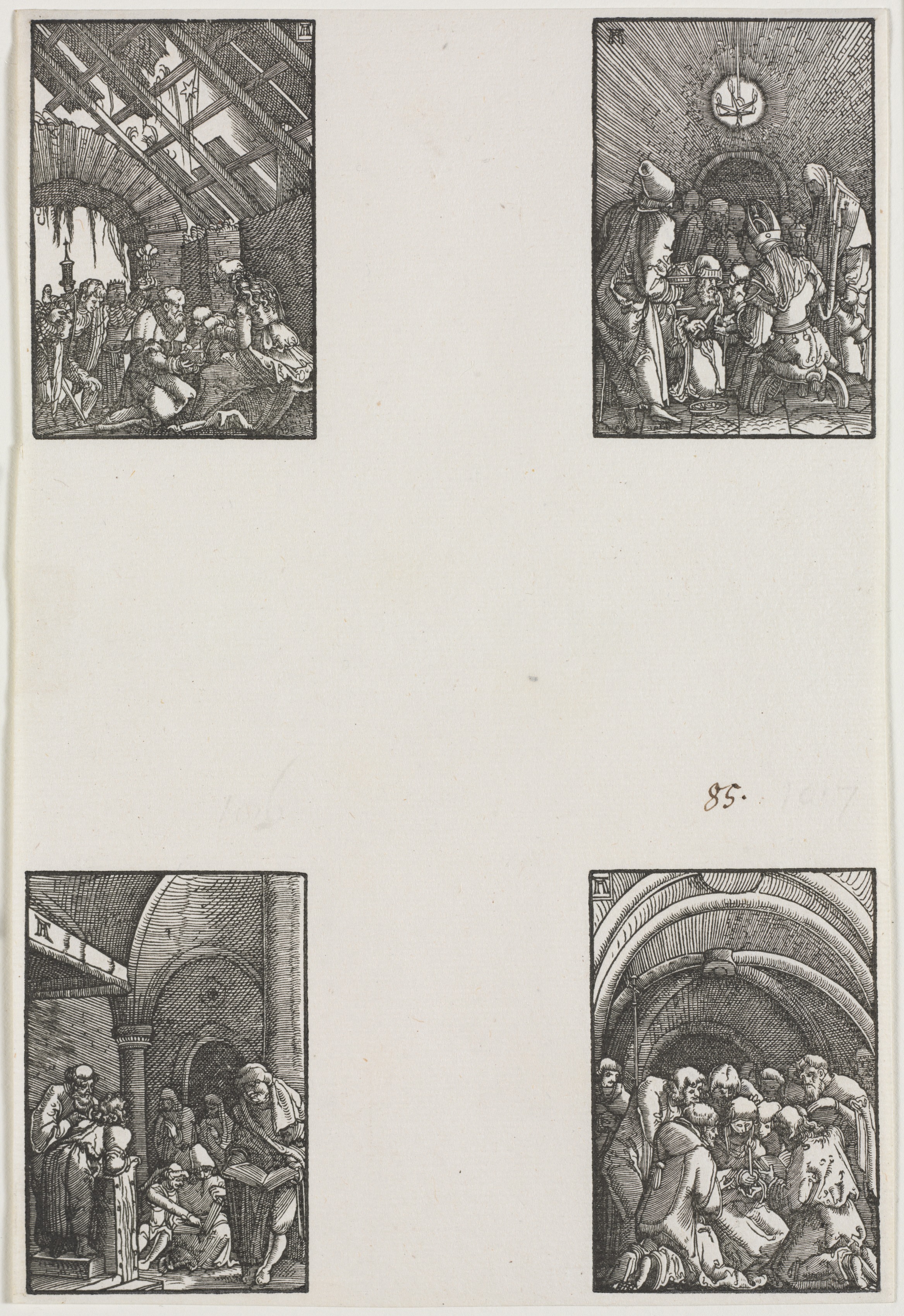 The image shows four square illustrations. The top left illustration depicts a group of people gathered around a figure lying on the ground. The top right illustration shows a group of people gathered under a radiant symbol. The bottom left illustration features a group of people standing and sitting in an arched building. The bottom right illustration depicts a group of people gathered under a large archway. The illustrations are in black and white and appear to be etchings. The illustrations are arranged in two rows of two on a white background. The number 85 is handwritten in the center of the image. The illustrations are attributed to Albrecht Altdorfer and titled "The Fall and Redemption of Man".