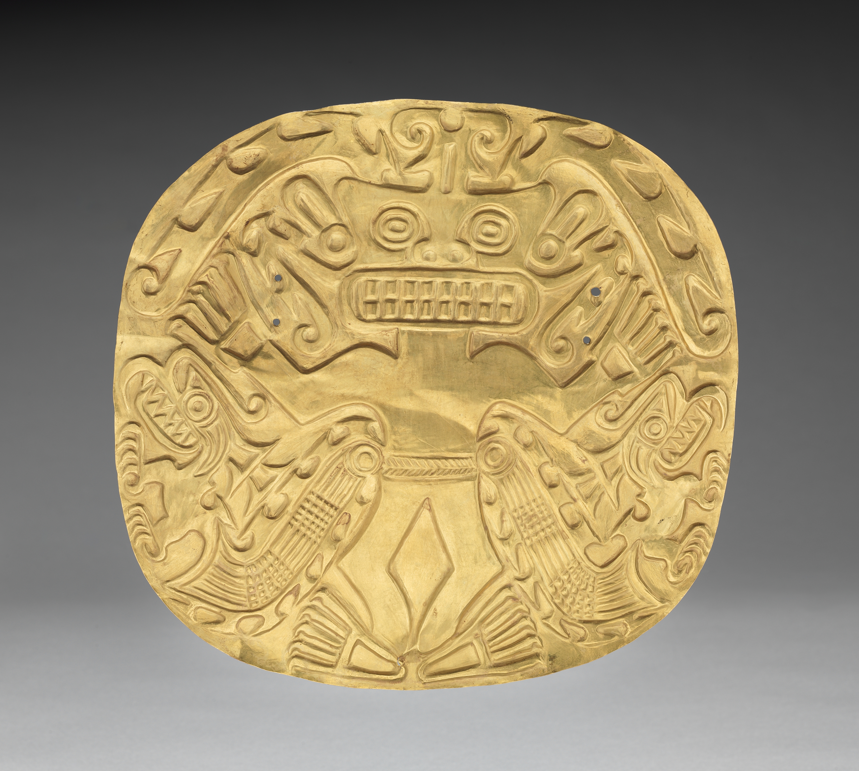 Gold-colored, round, flat, and smooth plaque with a raised design. The plaque has a face with a large mouth and two circular eyes at the top. There are two bird-like creatures on either side, with their wings spread out. The background of the plaque features various curved and spiral patterns. The plaque has a dark gray background that lightens towards the bottom.