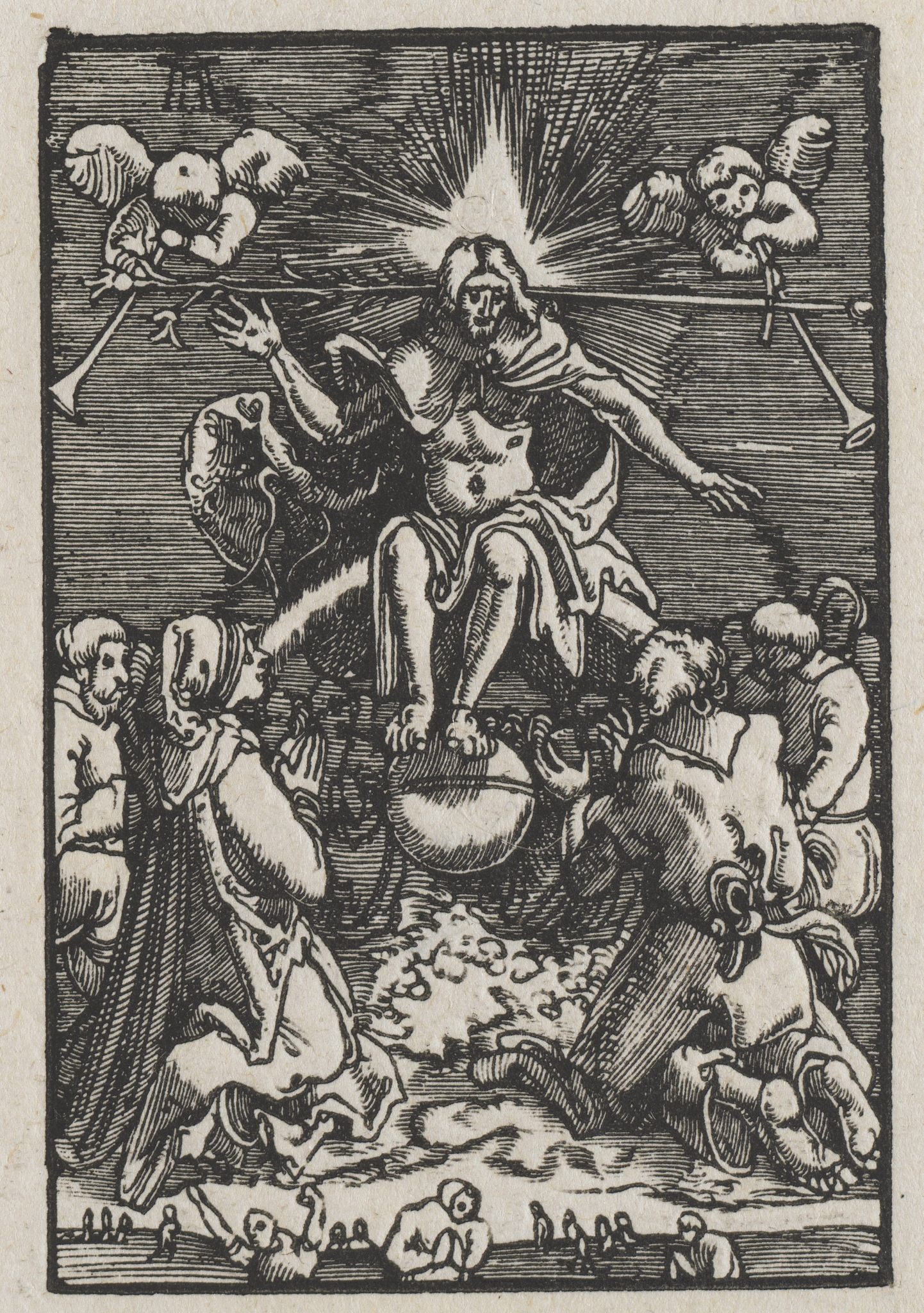 Black and white image. Christ sitting on a globe, surrounded by people. Christ has long hair and a beard, with a cloth over left shoulder; right arm outstretched; left arm bent at elbow. Two angels on either side of Christ blowing trumpets. People around globe on knees with hands clasped or raised. Globe sits on ground with rays emitting from it. Bottom of image shows small figures. Image is bordered with black line. Background behind Christ is shaded.
