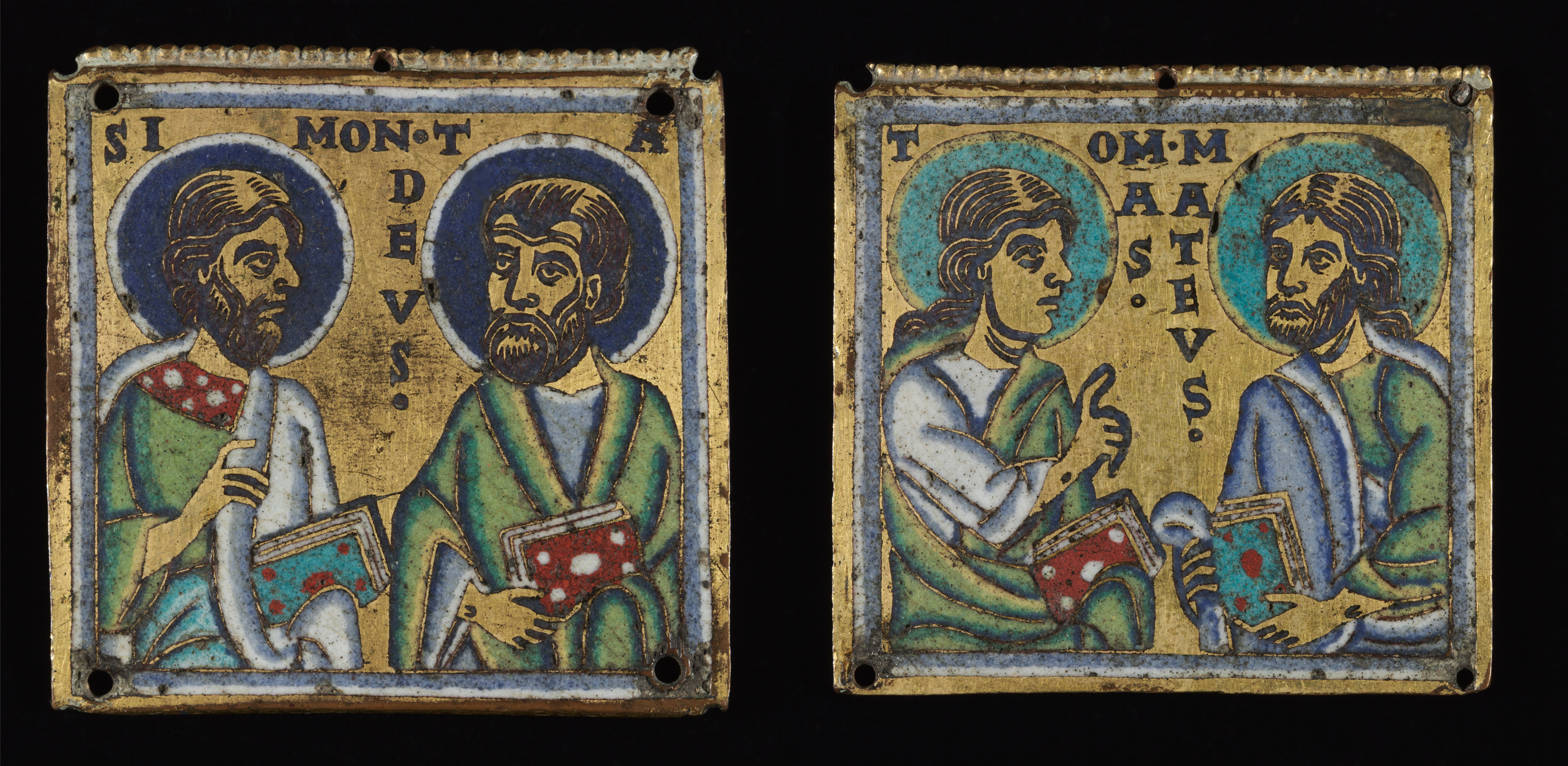 Two square plaques side by side on a black background. Each plaque has a gold background with a blue border. The left plaque depicts two men with brown hair and beards. The man on the left has a blue halo and holds a red and blue book. The man on the right has a green robe over a white robe with red and white dots on the shoulder. The man on the right holds a book. The right plaque depicts two men with brown hair and beards. The man on the left has a blue halo and a green robe over a white robe. The man on the right has a blue robe over a white robe. The man on the right holds a red and blue book. The man on the left holds up his right index finger. The plaques have holes in each corner. The plaques have black writing at the top. The left plaque says "S I M O N T H A D D A E V S." The right plaque says "T O M M A A T H E V S."