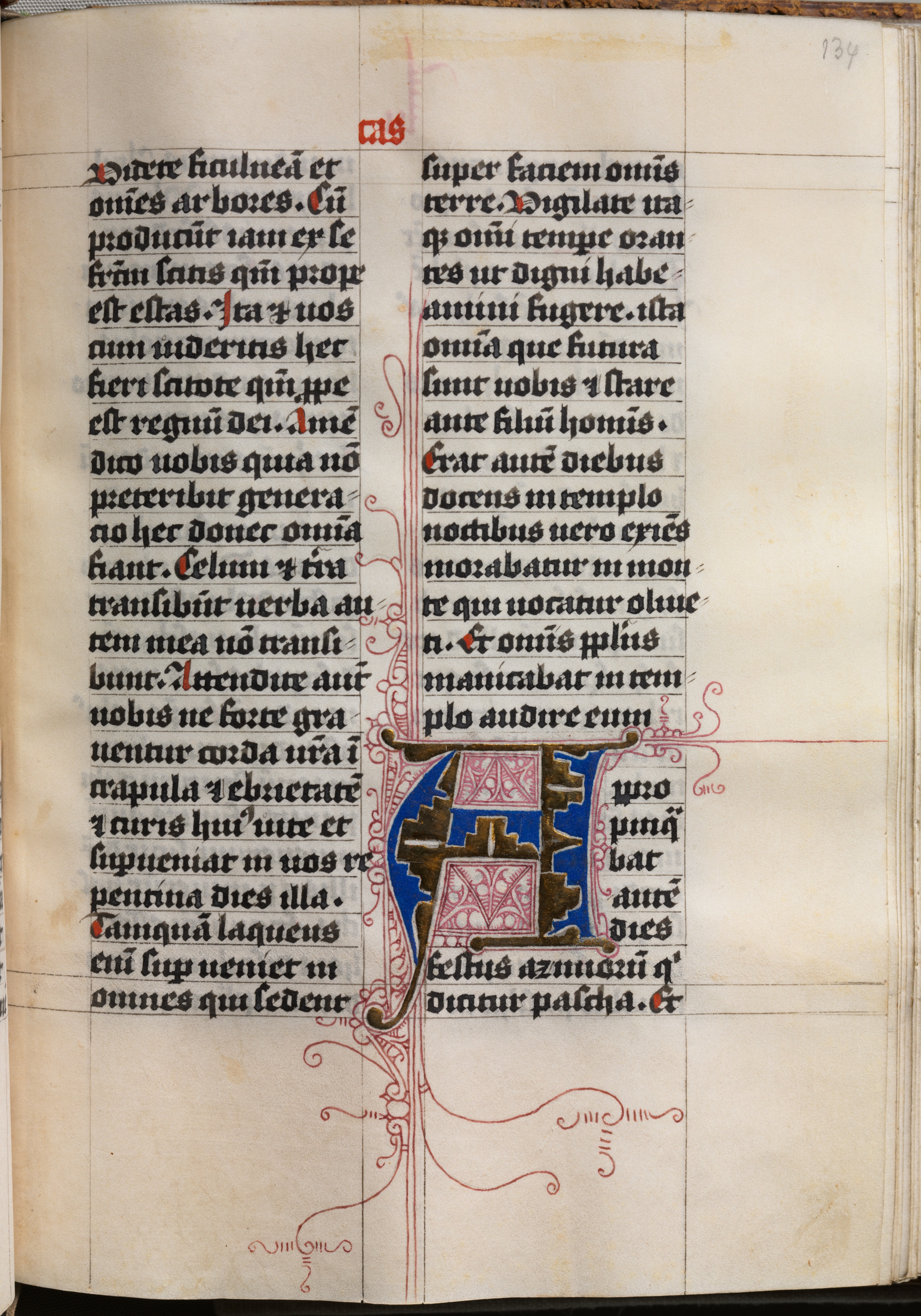 The image shows a page from an old book. The page is yellowed and has a red line down the center. There are two columns of black text in a medieval font. A large, decorative initial letter is present, featuring gold, blue, and red colors, surrounded by red filigree that extends down the page. The page number "134" is in the top right corner. The text is written in Latin. The image appears to be a reproduction or scan of an illuminated manuscript page.