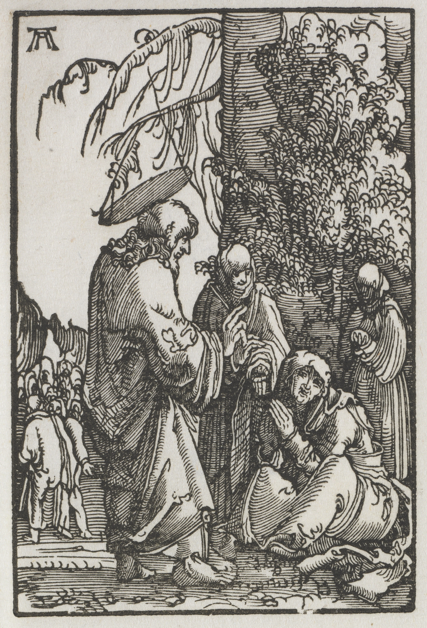 Black and white image. Man in a robe on one knee, hands raised in front of chest. Two men stand behind him. Large man on left wearing a hat and robe turns toward the kneeling man. Man on right wears long robe. Tree trunk and foliage on right. Figures in background on far left. Border around the image. The scene depicts Jesus Christ taking leave of his mother.