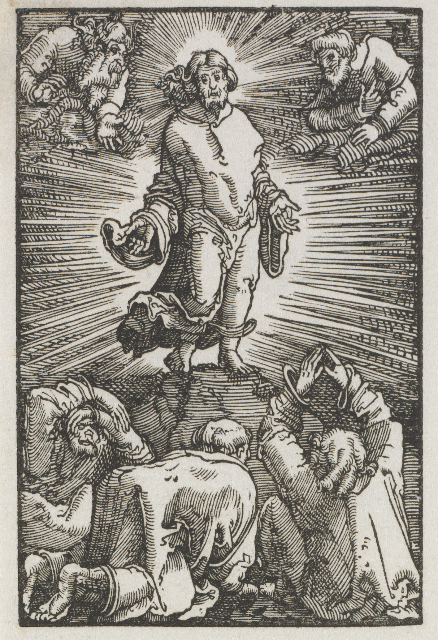 Black and white drawing of a religious scene with lines radiating from the center. The central figure is a man with long hair and a beard wearing a robe. He stands on a hill with his left leg bent; his right leg appears to be hovering above the ground. He holds an object in each hand. Behind him are lines representing rays of light and two figures. The bottom half of the image shows four men on the ground looking up; two on the right and two on the left. The two on the right appear to be wearing hats. The two on the left are bearded and have their hands close to their chests. The background shows dense short lines, both vertically and horizontally.