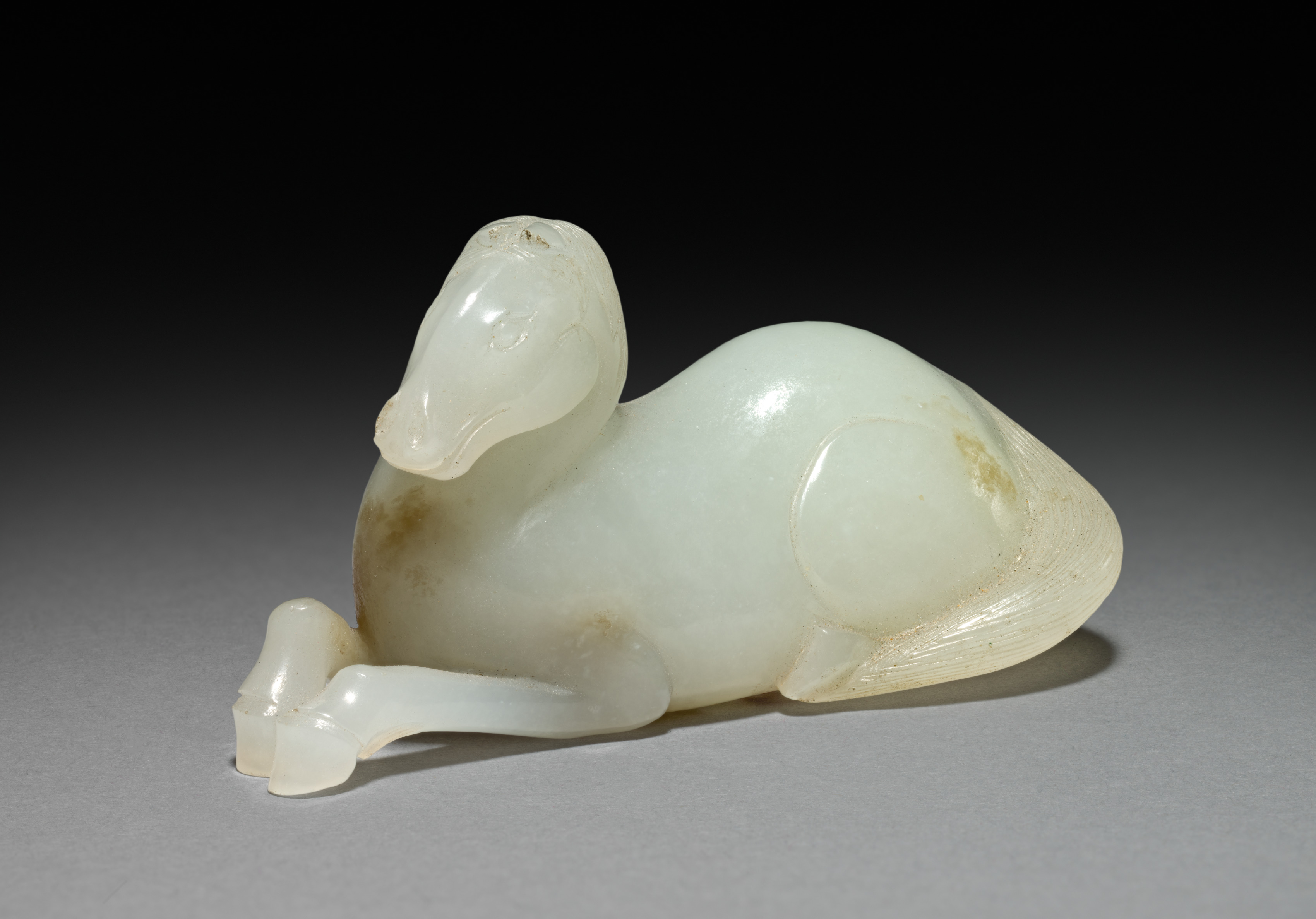 White jade sculpture of a horse lying down, with head turned to the left, on a gray surface with a black background. The horse's body is smooth and glossy, with some brown spots. The horse's front legs are bent under its body, and its back legs are stretched out behind it. The horse's head is carved with details such as eyes, nostrils, and a mouth. The sculpture is titled "Horse" and is by an unknown artist.