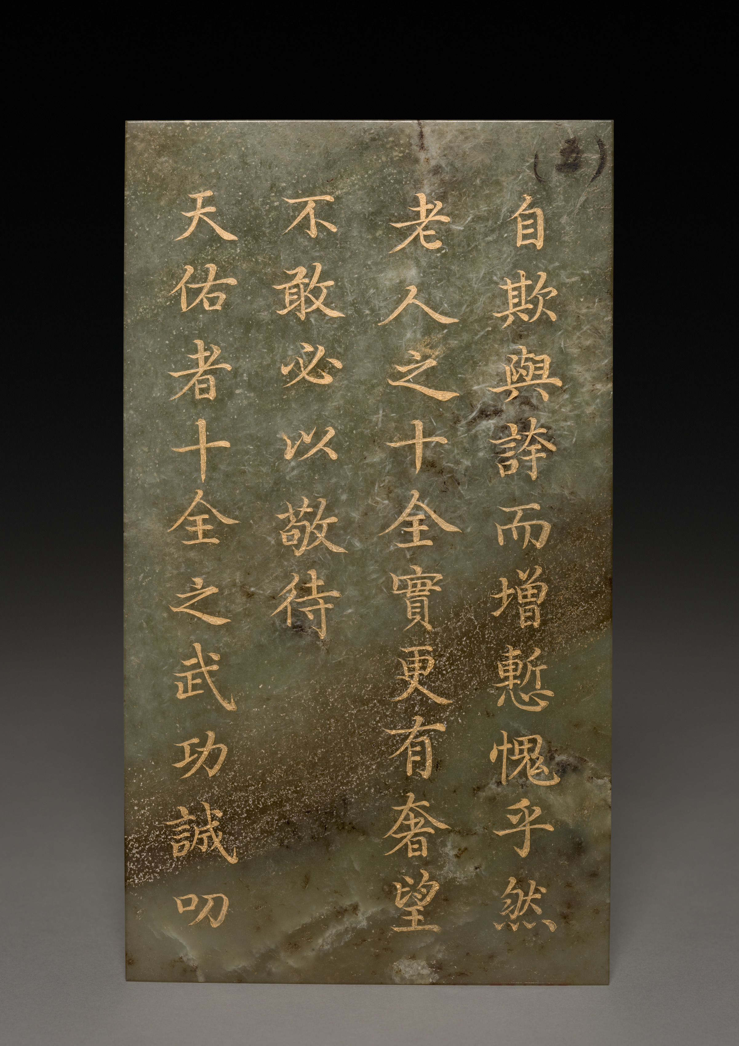 A green, rectangular stone tablet with darker green and brown mottling. The surface contains carved golden Chinese characters arranged in four columns that are right-aligned. The characters on the left and right are vertically aligned. The background behind the tablet fades from black at the top to gray at the bottom. The title is "Tablet" and the artist is unknown.