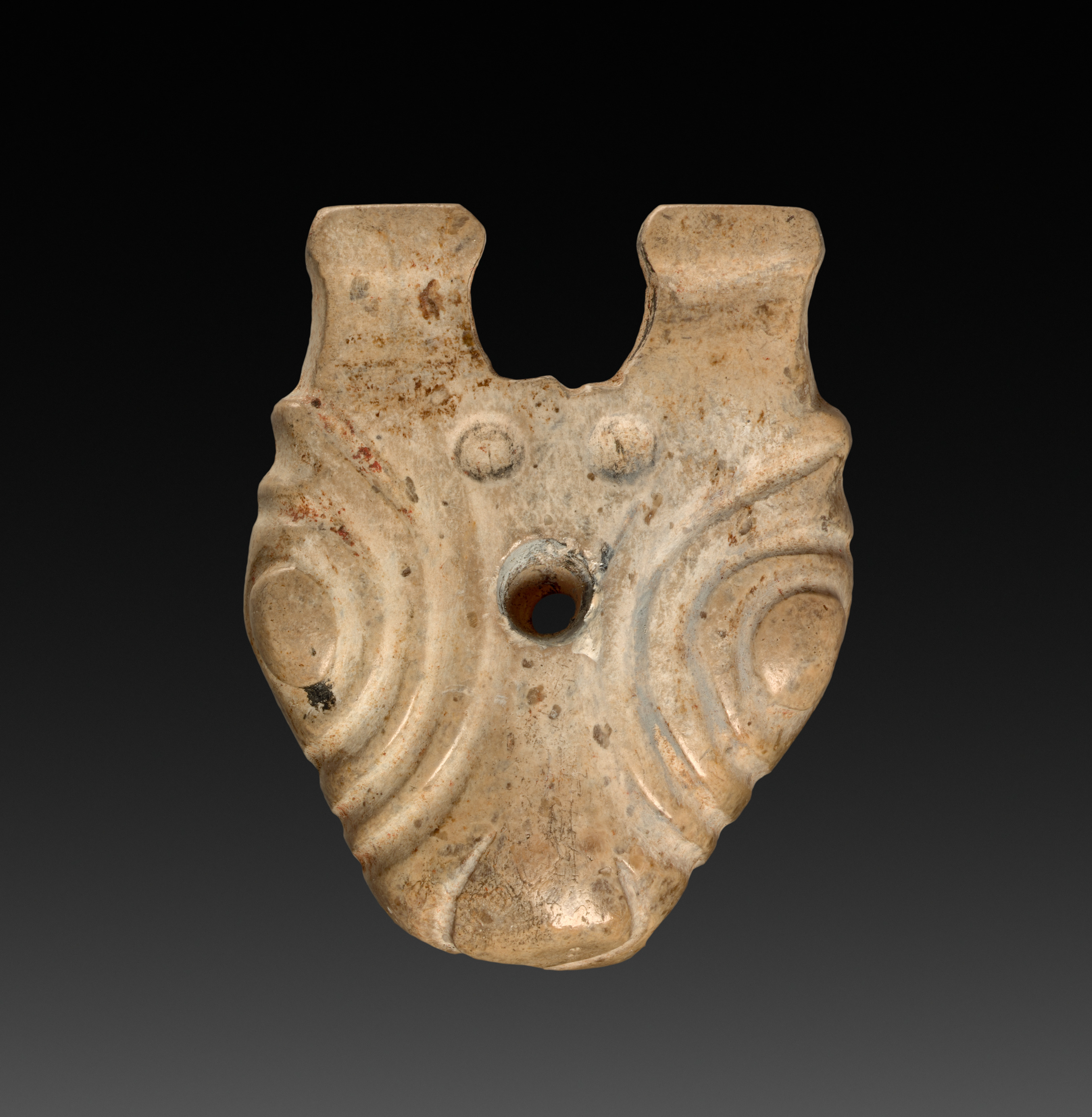 Beige-colored bovine mask with two capped horns; U-shaped cutout at top; one circular hole in center; double curved lines on either side; circular indents on top; surface scratched and discolored; black-to-gray gradient background.