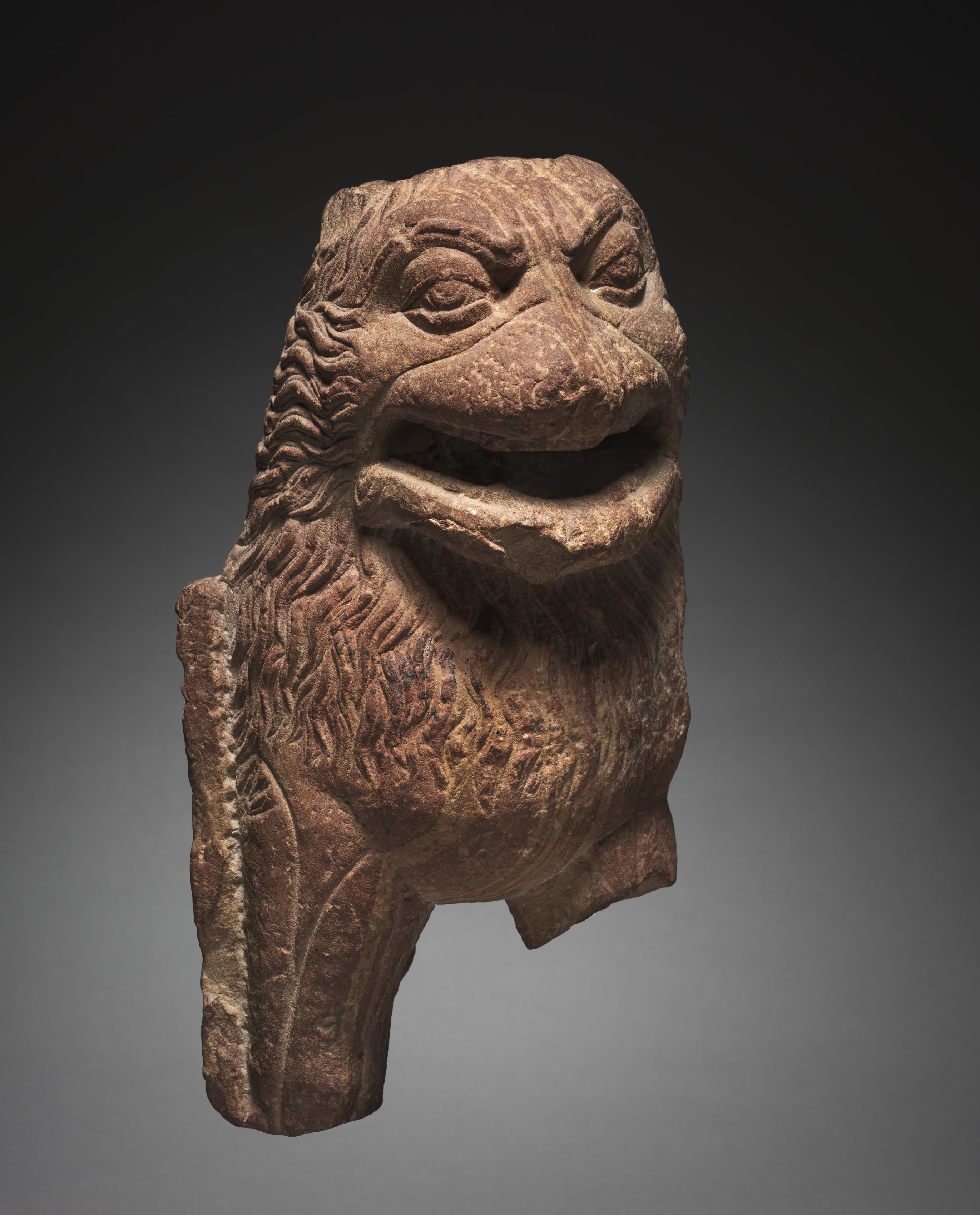 Brown sculpture of a lion's head facing right. The sculpture has a wide mouth with the top lip curled up. The eyes are rounded and the eyebrows are thick and raised. The mane is depicted with wavy lines. The background is dark gray, transitioning to black at the top.