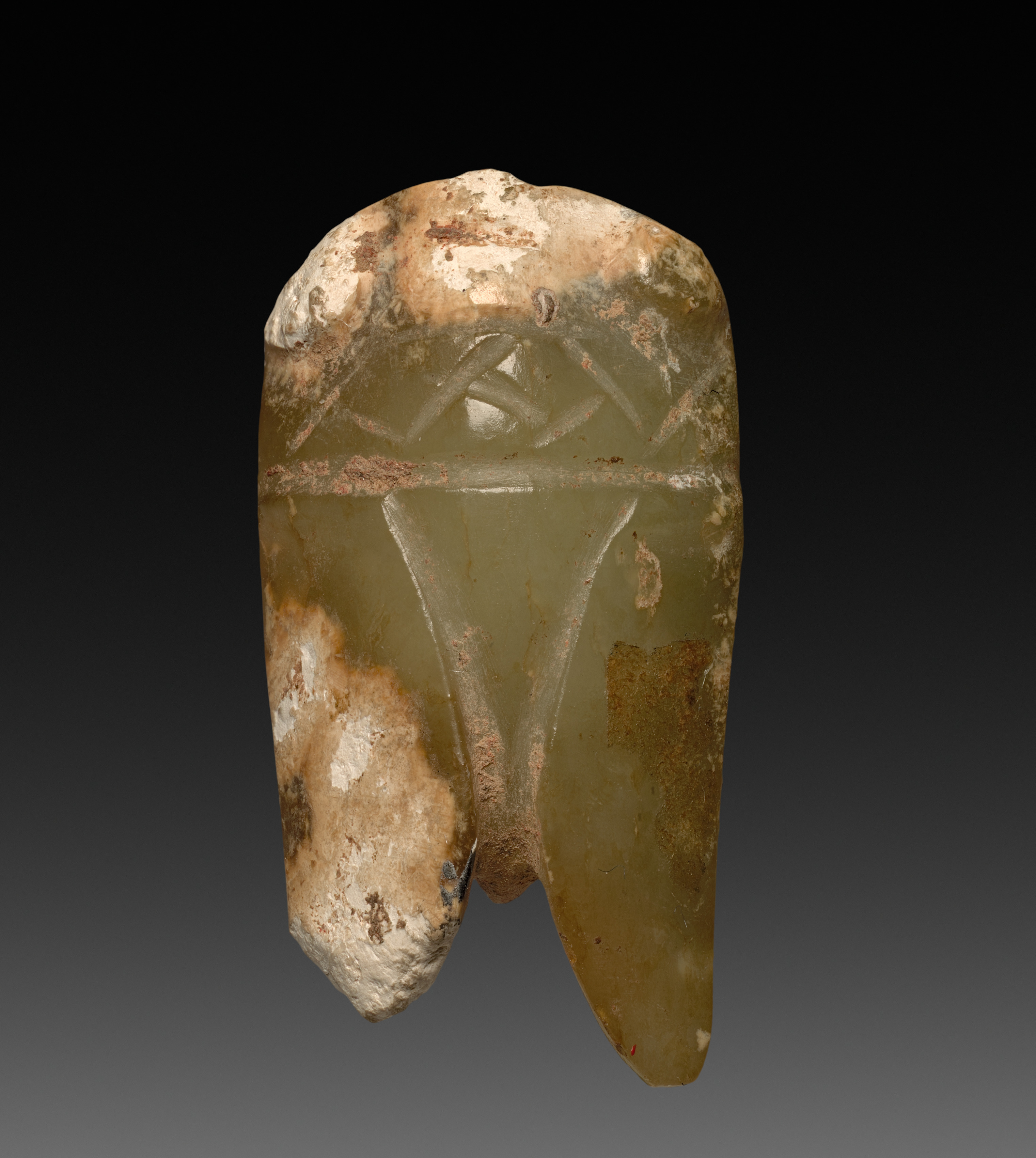 The object is an Old Chinese jade cicada. The jade cicada has a smooth and weathered surface with a predominantly green color. The jade is semi-transparent. The top half is rounded and white with brown patches. The bottom half is carved into the shape of a cicada with geometric patterns on the top and veins on the bottom. The bottom half also features a jagged edge where it appears to have been broken off. The background is a gradient from black to gray.