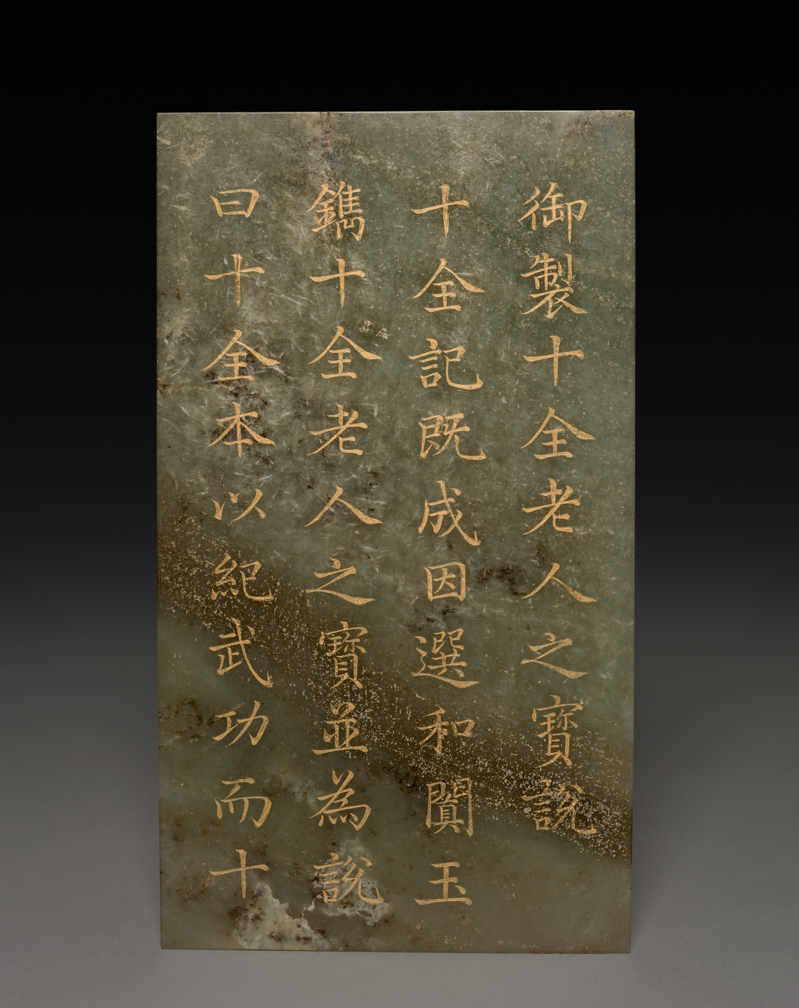 Gray-green stone tablet with darker gray-green and brown patches; gold writing; square shape with right side slightly rounded; background fades from black at top to gray at bottom. Title: Tablet Artist: Unknown