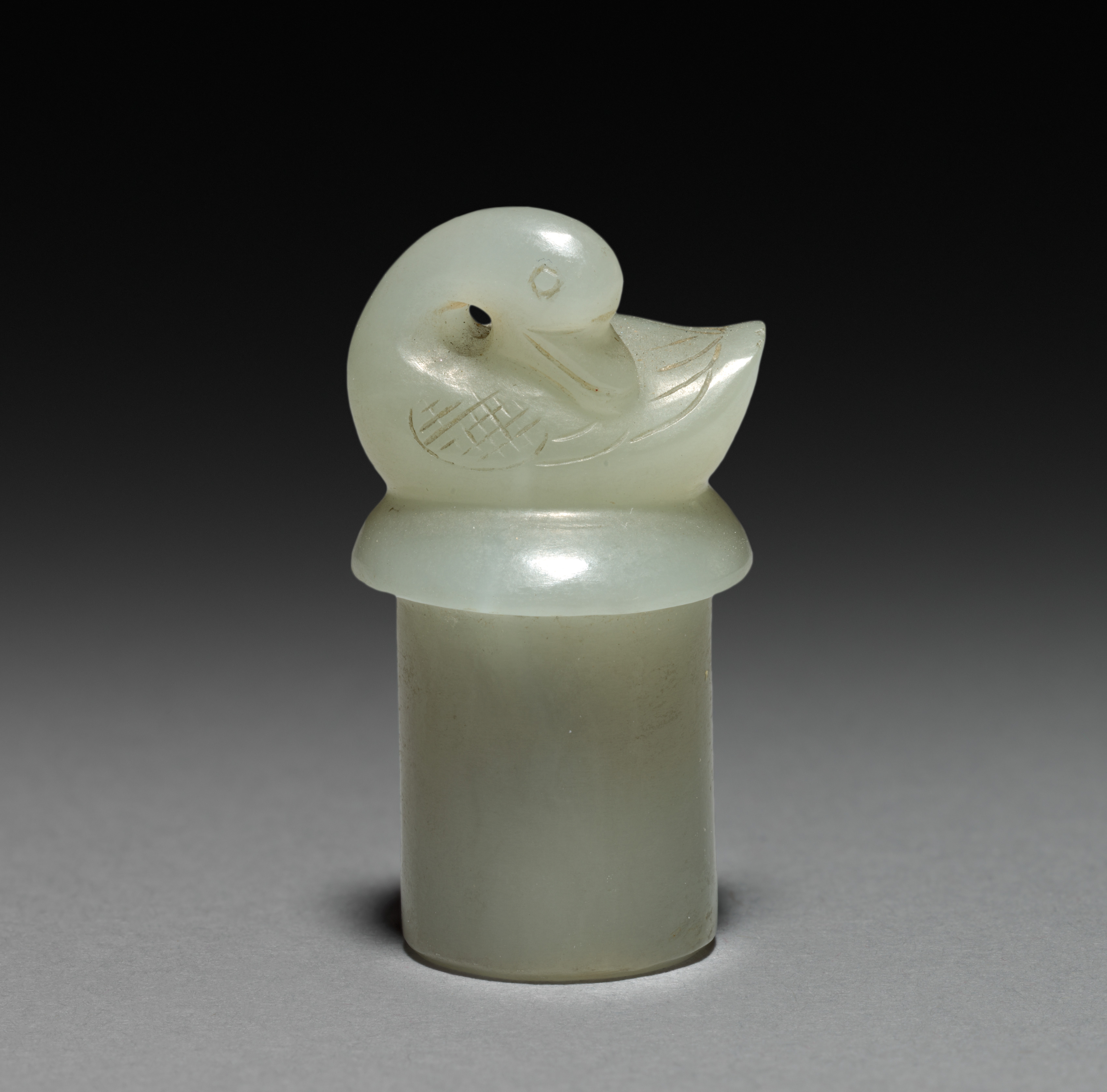 White jade carving of a goose and goslings on top of a cylindrical stopper. The goose has a large head and body with an engraved wing on one side. The goose's eye is a small black dot. The goslings are stacked on top of each other, with the bottom one having a large head and a small body. The stopper is cylindrical and has a flat top. The background is black to gray gradient.