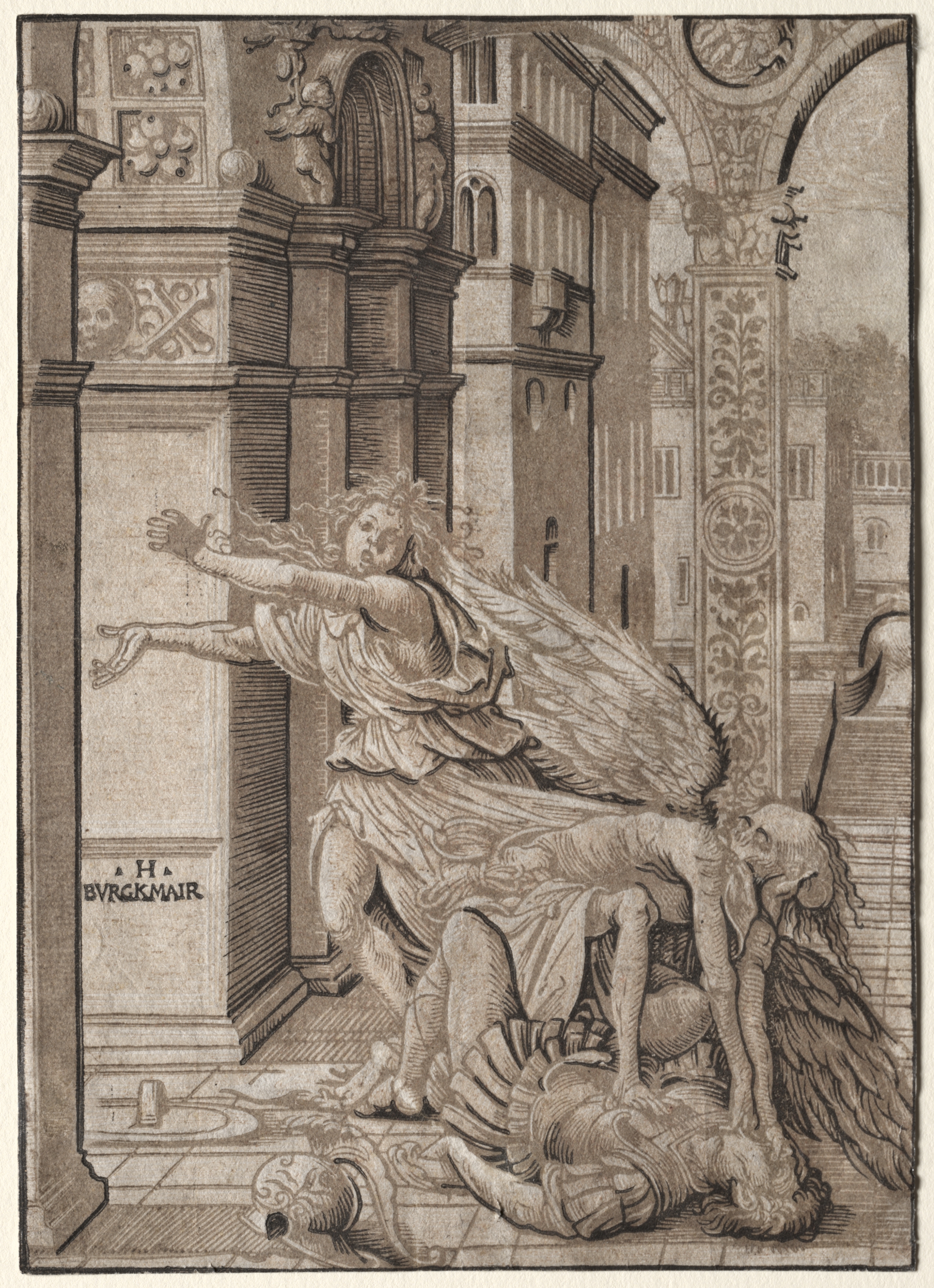 The image depicts a sepia-toned drawing of a scene with a man and woman. The woman, wearing a long dress, is standing with her right arm extended outward. An angel-like figure with wings is bending over a man lying on the ground, who appears to be deceased. The man on the ground has long hair and is dressed in a long-sleeved shirt. The background features a stone floor, ornate pillars, and a building with arches and windows. The pillars have decorative carvings, including a skull and crossbones on one. The artist's signature appears on the left side of the image. The overall mood is somber. "The Lovers Surprised by Death" is an artwork by Hans Burgkmair.