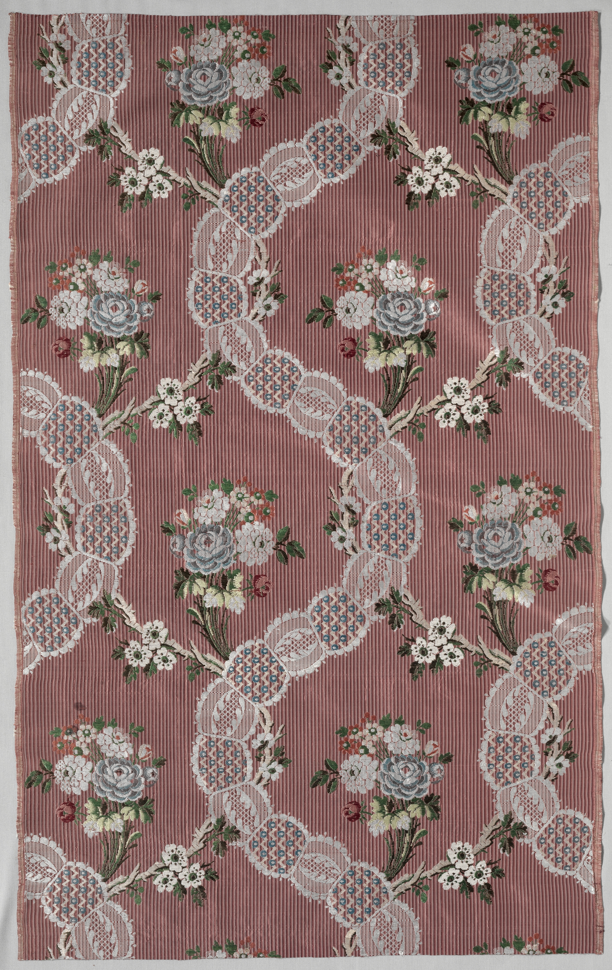 The image shows a piece of fabric titled "Length of Silk Brocade" by an unknown artist. The fabric features a dusty rose background with thin, evenly spaced vertical stripes. The fabric has a repeating design of white lace-like patterns that form interconnected ovals. Inside and around the ovals are clusters of flowers in various shades of white, blue-gray, and green, with some small red flowers. The edges of the fabric are slightly frayed and uneven. The fabric appears to have a textured surface, likely due to the brocade technique used to create it.