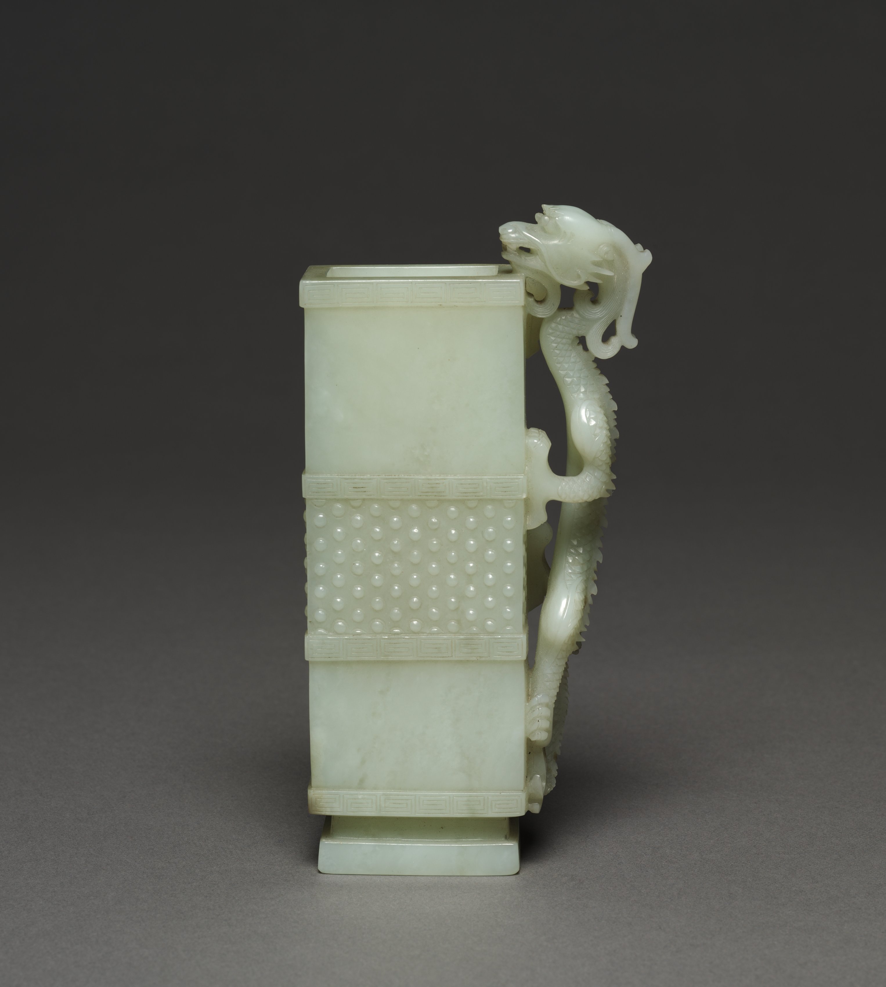 Rectangular wine cup with a dragon handle. The cup is made of white jade and has a rectangular body with a flat top and bottom. The body is decorated with a band of raised dots on the middle section and Greek key designs on the top and bottom. A dragon handle protrudes from the right side, curling up and back over the top. The dragon's head is on the right side of the cup's top. The cup sits on a small rectangular base. The background is dark gray.