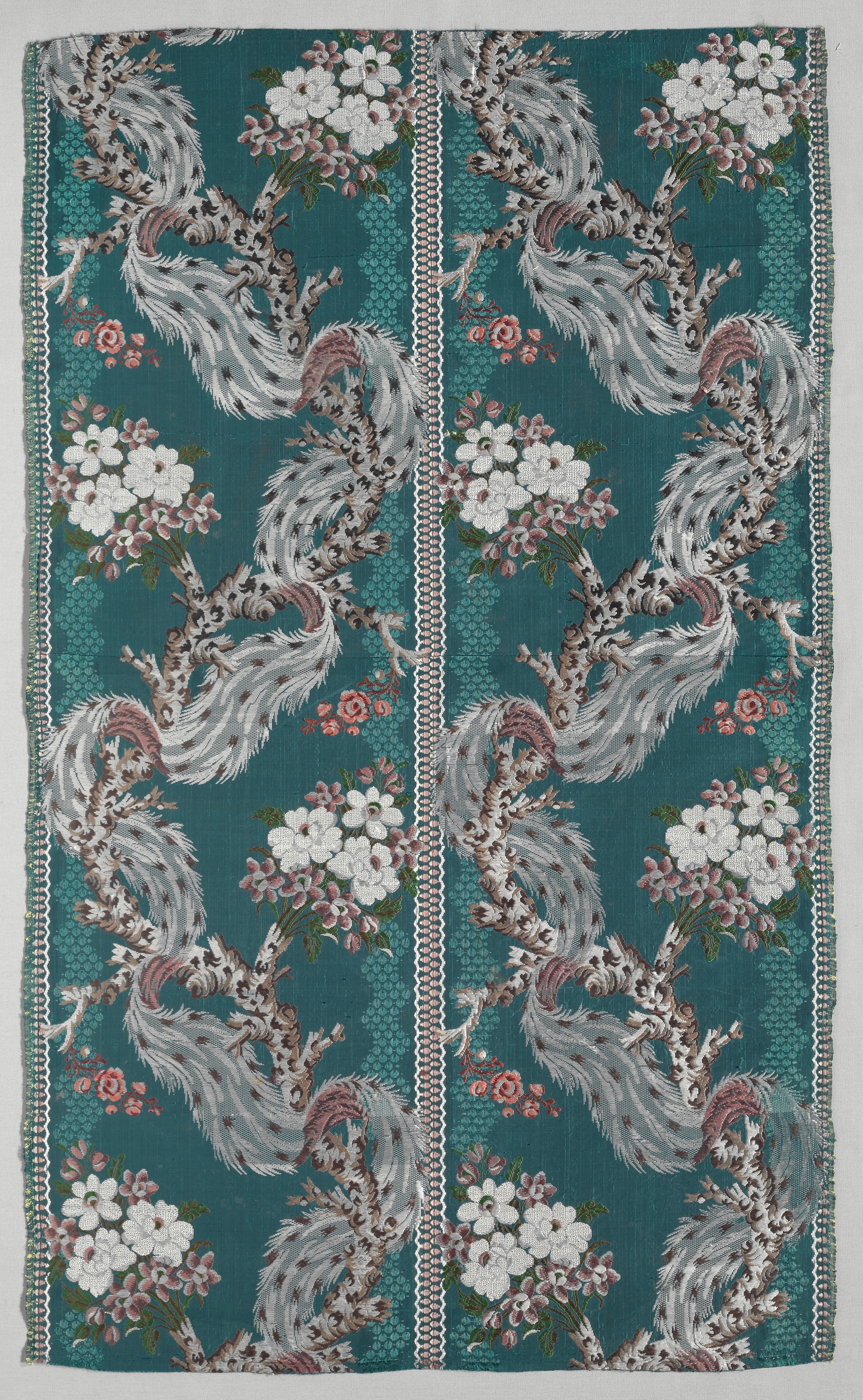 Teal-colored fabric with a repeating pattern. The pattern features a white and pink peacock-like bird on a branch with white flowers and pink flowers. A vertical line of white and teal trim divides the repeating sections. The border is teal and white trim. The fabric is titled "Length of Brocaded Silk".