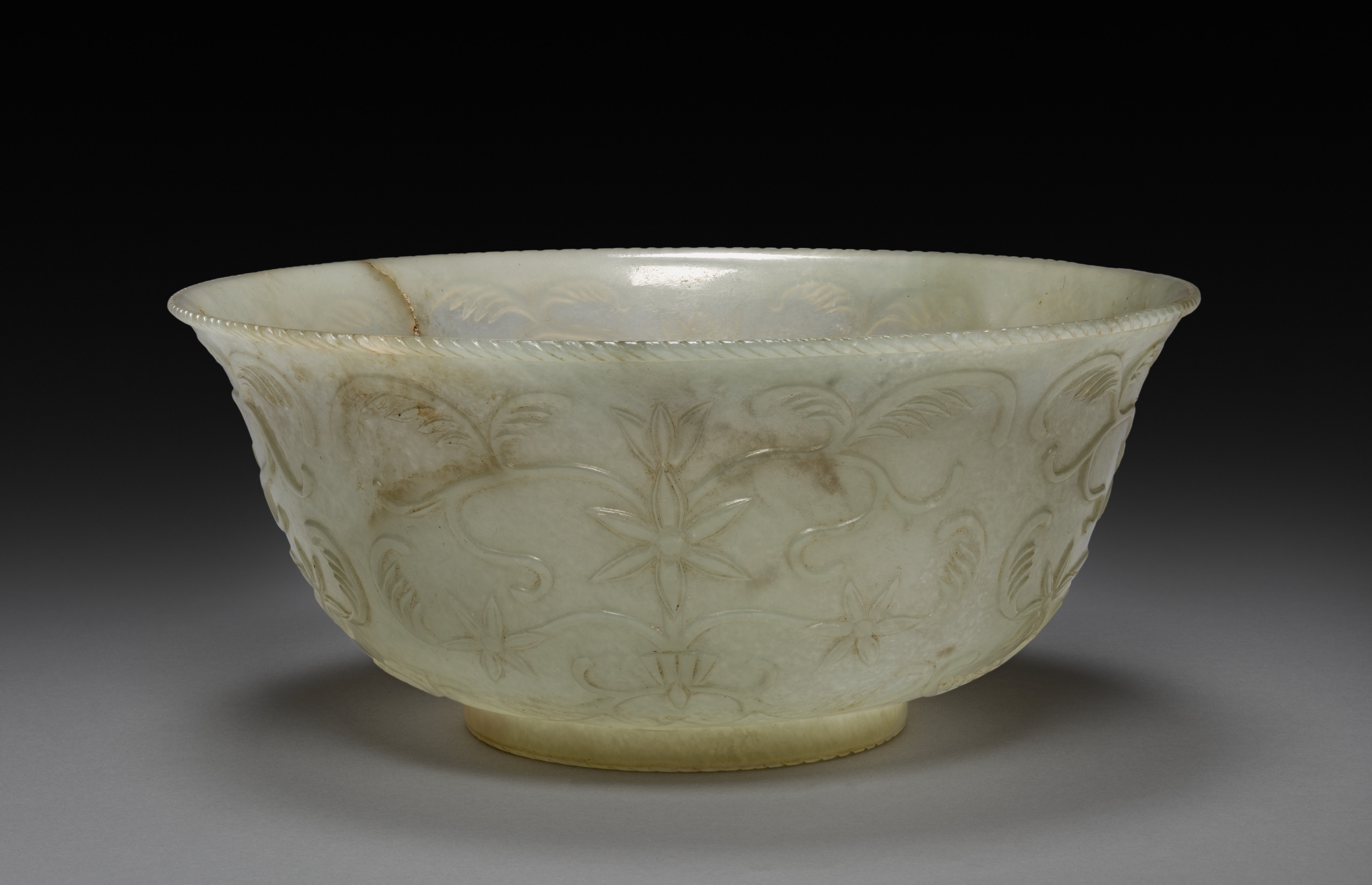 White jade bowl; title "Bowl" by an unknown artist. A white jade bowl with a carved design. The bowl is rounded with a wide mouth that flares out to a rope-like edge; the base is circular. A carved design on the bowl depicts a repeating pattern of raised flowers and leaves against a smooth background. The bowl's color is predominantly white with a slight yellow tint at the base. The background is dark at the top and gradually fades to light gray towards the bottom.