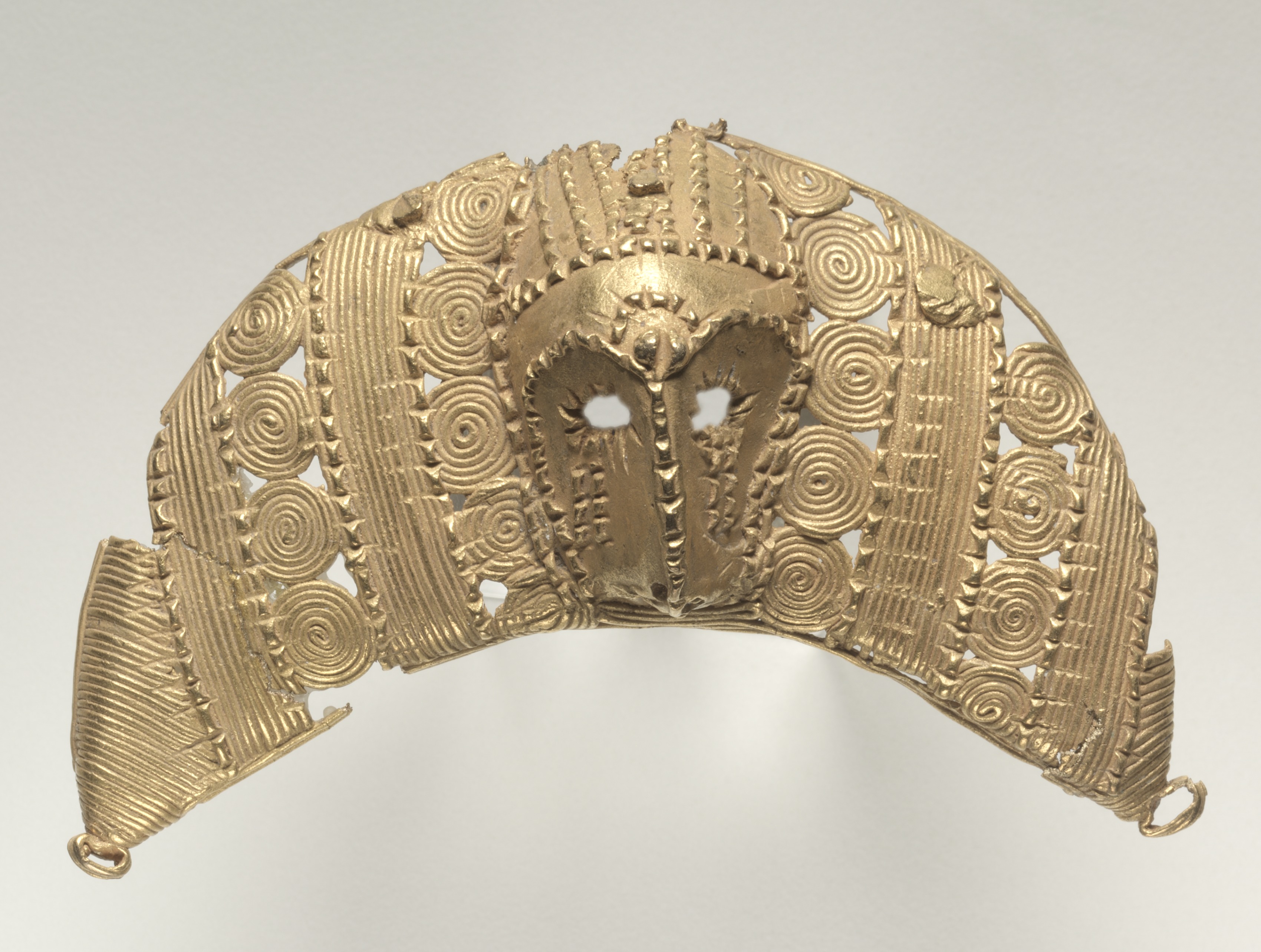 Gold pendant in the shape of a half-circle. The pendant has a flat, smooth, domed area at the top center with two rectangular cutouts for eyes and a slit cutout for a mouth. The rest of the pendant is decorated with a repeating pattern of raised concentric circles and vertical ridges. There are small loops on either end. The background of the image is light gray. The pendant, titled "Pendant", is by an unknown artist.