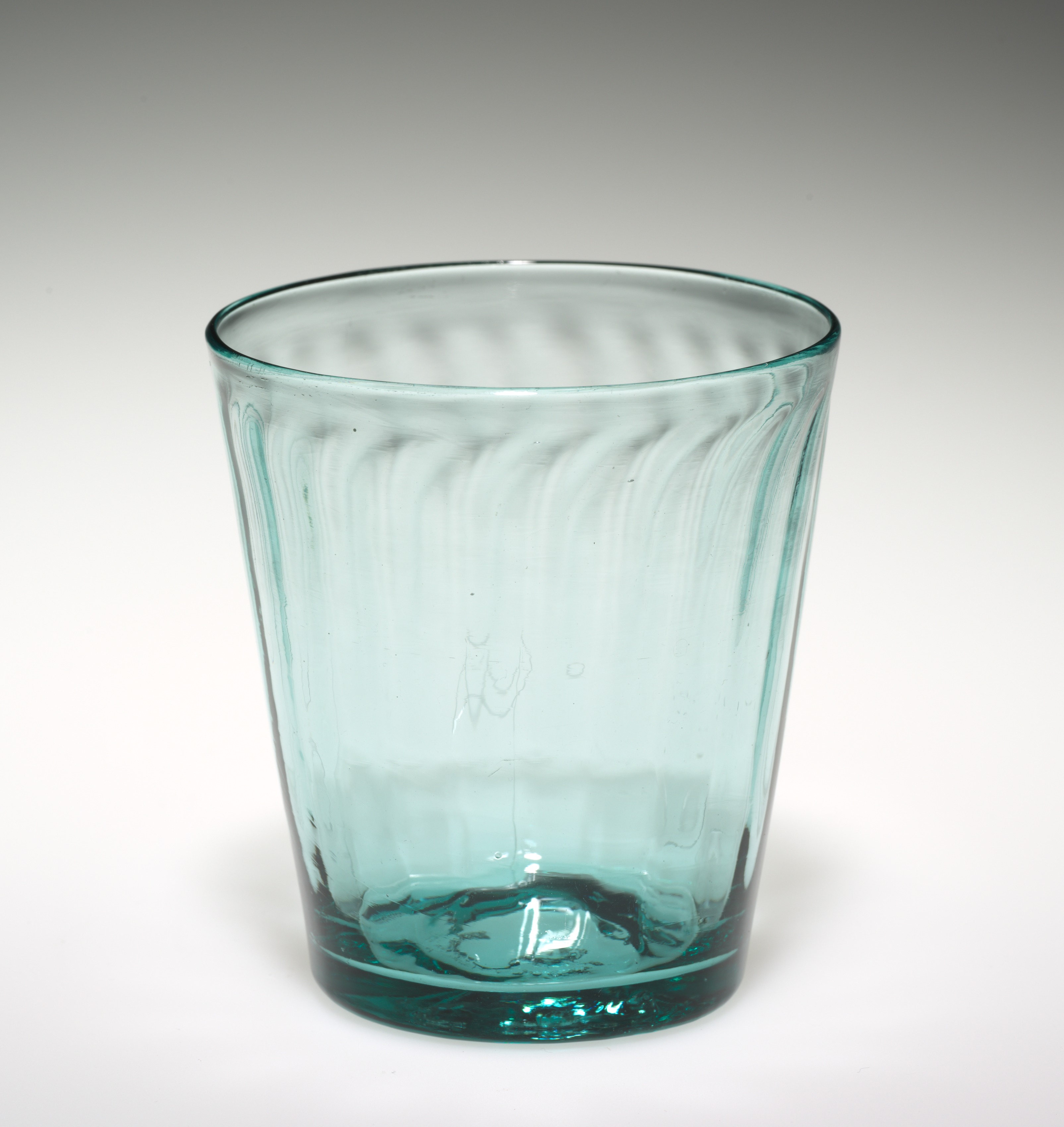 Tumbler by Lino Tagliapietra. The image shows a short, wide tumbler glass made of translucent teal-colored glass. The glass features vertical ridges on its body. The glass has a flat rim and a flat base. The glass is empty. The background is white with a gray gradient at the top. The glass casts a faint shadow on the surface below it.
