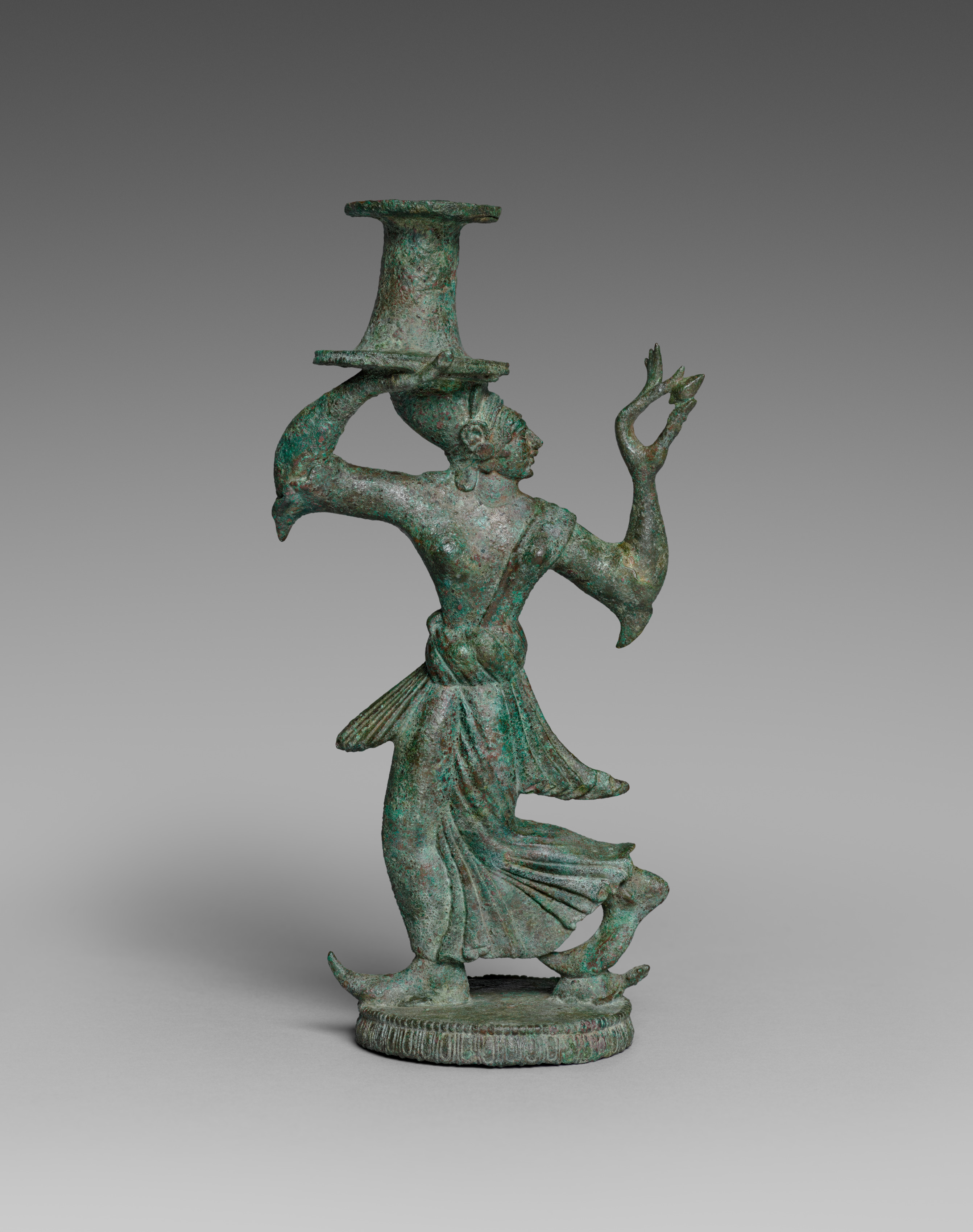 The bronze statue depicts a woman in a dancing pose. She wears a short dress with a belt around her waist. One arm is raised upwards with the fingers curled; the other arm extends to the left, holding a candelabrum. The candelabrum features three openings at the top. The statue stands on a round base; its green patina shows signs of wear. The background features gradient gray tones. The title of the artwork is Candelabrum Stand of a Dancing Maenad.
